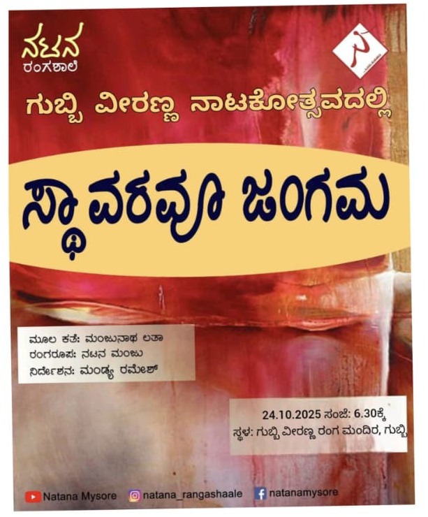 ಗುಬ್ಬಿ : ನಟನ ರಂಗಶಾಲೆಯ ವತಿಯಿಂದ ಗುಬ್ಬಿ ವೀರಣ್ಣ ನಾಟಕೋತ್ಸವದಲ್ಲಿ ‘ಸ್ಥಾವರವೂ ಜಂಗಮ’ ನಾಟಕ ಪ್ರದರ್ಶನವನ್ನು ದಿನಾಂಕ 24 ಅಕ್ಟೋಬರ್ 2025ರಂದು ಸಂಜೆ 6-30 ಗಂಟೆಗೆ ಗುಬ್ಬಿ ವೀರಣ್ಣ ರಂಗ ಮಂದಿರದಲ್ಲಿ ಹಮ್ಮಿಕೊಳ್ಳಲಾಗಿದೆ. ಈ ನಾಟಕದ ಮೂಲ ಕಥೆ ಮಂಜುನಾಥ ಲತಾ, ರಂಗರೂಪ ನಟನ ಮಂಜು ಇವರು ನೀಡಿದ್ದು, ಮಂಡ್ಯ ರಮೇಶ್ ನಿರ್ದೇಶನ ಮಾಡಿರುತ್ತಾರೆ.