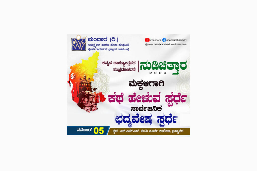 ಬ್ರಹ್ಮಾವರ : ಬೈಕಾಡಿಯ ಮಂದಾರ ಸಾಂಸ್ಕೃತಿಕ ಹಾಗೂ ಸೇವಾ ಸಂಘಟನೆಯು ಕನ್ನಡ ರಾಜ್ಯೋತ್ಸವದ ಸಂಭ್ರಮಾಚಾರಣೆ ಪ್ರಯುಕ್ತ ‘ನುಡಿ ಚಿತ್ತಾರ -2023’ ಮಕ್ಕಳಿಗಾಗಿ ಕಥೆ ಹೇಳುವ ಸ್ಪರ್ಧೆ ಮತ್ತು ಸಾರ್ವಜನಿಕರಿಗಾಗಿ ಛದ್ಮವೇಷ ಸ್ಪರ್ಧೆಯನ್ನು (ವಿಷಯ : ಕನ್ನಡ ನಾಡು-ನುಡಿ ಮತ್ತು ಸಂಸ್ಕೃತಿ) ಆಯೋಜಿಸುತ್ತಿದೆ. ಸ್ಪರ್ಧೆಗಳು ದಿನಾಂಕ 05-11-2023ರಂದು ಬ್ರಹ್ಮಾವರದ ಎಸ್.ಎಂ.ಎಸ್. ಪದವಿ ಪೂರ್ವ ಕಾಲೇಜಿನಲ್ಲಿ ನಡೆಯಲಿದೆ.