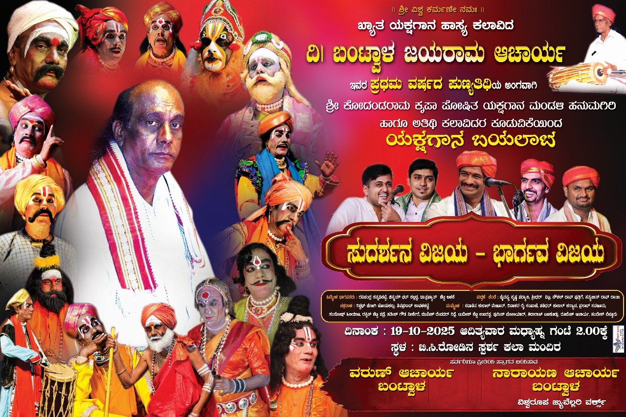 ಬಂಟ್ವಾಳ : ಖ್ಯಾತ ಯಕ್ಷಗಾನ ಹಾಸ್ಯ ಕಲಾವಿದ ದಿ. ಬಂಟ್ವಾಳ ಜಯರಾಮ ಆಚಾರ್ಯ ಇವರ ಪ್ರಥಮ ವರ್ಷದ ಪುಣ್ಯತಿಥಿಯ ಅಂಗವಾಗಿ ಶ್ರೀ ಕೋದಂಡರಾಮ ಕೃಪಾ ಪೋಷಿತ ಯಕ್ಷಗಾನ ಮಂಡಳಿ ಹನುಮಗಿರಿ ಹಾಗೂ ಅತಿಥಿ ಕಲಾವಿದರ ಕೂಡುವಿಕೆಯಿಂದ ಯಕ್ಷಗಾನ ಬಯಲಾಟ ‘ಸುದರ್ಶನ ವಿಜಯ – ಭಾರ್ಗವ ವಿಜಯ’ ದಿನಾಂಕ 19 ಅಕ್ಟೋಬರ್ 2025ರ ಆದಿತ್ಯವಾರದಂದು ಅಪರಾಹ್ನ ಘಂಟೆ 2.00ರಿಂದ ಬಿ. ಸಿ ರೋಡಿನ ಸ್ಪರ್ಶ ಕಲಾ ಮಂದಿರದಲ್ಲಿ ನಡೆಯಲಿದೆ.