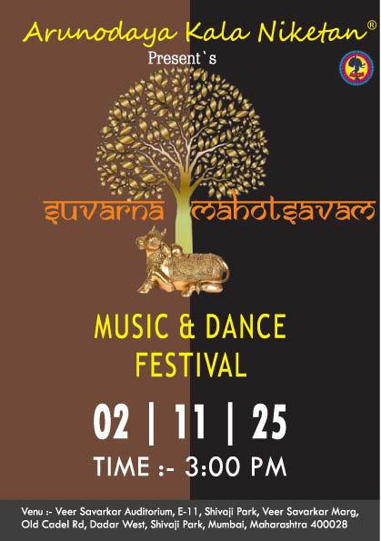 ಮುಂಬೈ : ಅರುಣೋದಯ ಕಲಾ ನಿಕೇತನ್ ಪ್ರಸ್ತುತ ಪಡಿಸುವ ‘ಸುವರ್ಣ ಮಹೋತ್ಸವಂ’ ಸಂಗೀತ ಮತ್ತು ನೃತ್ಯೋತ್ಸವವನ್ನು ದಿನಾಂಕ 02 ನವೆಂಬರ್ 2025ರಂದು ಸಂಜೆ 3-00 ಗಂಟೆಗೆ ಮಹಾರಾಷ್ಟ್ರ ಮುಂಬೈಯ ವೀರ ಸಾವರ್ಕರ್ ಸಭಾಂಗಣದಲ್ಲಿ ಹಮ್ಮಿಕೊಳ್ಳಲಾಗಿದೆ.