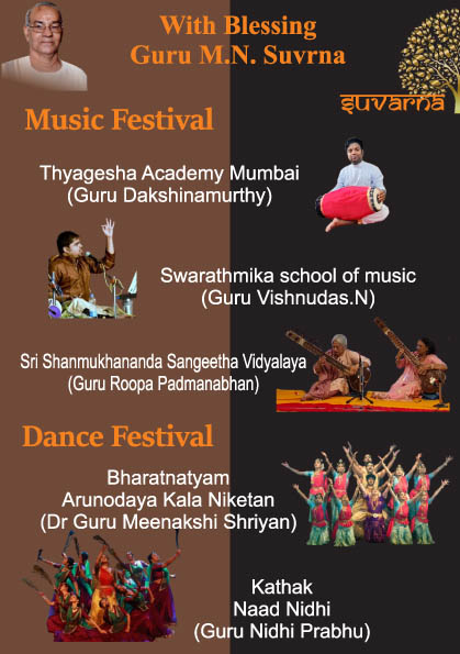 ಗುರು ಎಂ.ಎನ್. ಸುವರ್ಣ ಇವರ ಆಶೀರ್ವಾದದೊಂದಿಗೆ ನಡೆಯುವ ಸುವರ್ಣ ನೃತ್ಯೋತ್ಸವದಲ್ಲಿ ಮುಂಬೈಯ ತ್ಯಾಗೇಶ ಅಕಾಡೆಮಿಯ ಗುರು ದಕ್ಷಿಣಮೂರ್ತಿ, ಸ್ವರಾತ್ಮಿಕ ಸಂಗೀತ ಶಾಲೆಯ ಗುರು ವಿಷ್ಣುದಾಸ್ ಎನ್. ಮತ್ತು ಶ್ರೀ ಷಣ್ಮುಖಾನಂದ ಸಂಗೀತ ವಿದ್ಯಾಲಯದ ಗುರು ರೂಪಾ ಪದ್ಮನಾಭನ್ ಇವರುಗಳು ಸಂಗೀತ ಉತ್ಸವವನ್ನು ನಡೆಸಿಕೊಡಲಿದ್ದು ಹಾಗೂ ನೃತ್ಯ ಉತ್ಸವದಲ್ಲಿ ಅರುಣೋದಯ ಕಲಾ ನಿಕೇತನ್ ಇದರ ಗುರು ಮೀನಾಕ್ಷಿ ಶ್ರೀಯಾನ್ ಇವರ ಶಿಷ್ಯಂದಿರಿಂದ ಭರತನಾಟ್ಯ, ಗುರು ನಿಧಿ ಪ್ರಭು ಇವರ ನಾದ ನಿಧಿ ತಂಡದವರಿಂದ ಕಥಕ್, ಮುಂಬೈಯ ಸರ್ಫೋಜಿರಾಜೇಶ್ ಭರತ ಕಾಲೇಜ್ ಆಫ್ ಫೈನ್ ಆರ್ಟ್ಸ್ ಆ್ಯಂಡ್ ಕಲ್ಚರ್ ಇದರ ಗುರು ಸಂಧ್ಯಾ ಪುರೇಚಾ ಇವರ ಶಿಷ್ಯಂದಿರಿಂದ ಭರತನಾಟ್ಯ, ವೈಷ್ಣೋವಿ ಕಲಾ ಕ್ಷೇತ್ರದ ಗುರು ಆಶಾ ನಂಬಿಯಾರ್ ಇವರಿಂದ ಒಡಿಸ್ಸಿ, ನಲಂದ ನೃತ್ಯ ಕಲಾ ಮಹಾ ವಿದ್ಯಾಲಯದ ಗುರು ಉಮಾ ರೆಲೆ ಇವರ ಶಿಷ್ಯಂದಿರಿಂದ ಭರತನಾಟ್ಯ, ನೃತ್ಯಕಲಾಂಜಲಿ ಇನ್ಸ್ಟಿಟ್ಯೂಟ್ ಆಫ್ ಫೈನ್ ಆರ್ಟ್ ಇದರ ಗುರು ರಮೇಶ್ ಕೋಳಿ ಇವರ ಶಿಷ್ಯಂದಿರಿಂದ ಕೂಚಿಪುಡಿ ಮತ್ತು ನೃತ್ಯಾಭಿನಯದ ಗುರು ಕಬಿತ ಮೊಹಾಂತಿ ಇವರ ಶಿಷ್ಯಂದಿರಿಂದ ಒಡಿಸ್ಸಿ ಪ್ರಸ್ತುತಗೊಳ್ಳಲಿದೆ.
