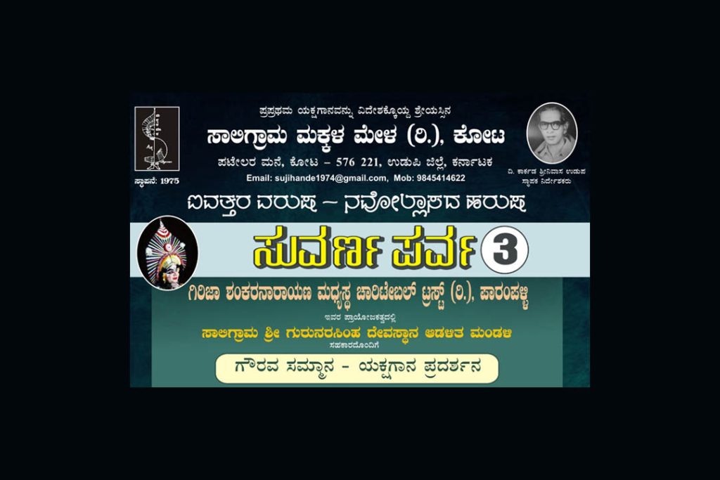 ಸಾಲಿಗ್ರಾಮ : ಐವತ್ತರ ವಸಂತದಲ್ಲಿರುವ ಕೋಟದ ಸಾಲಿಗ್ರಾಮ ಮಕ್ಕಳ ಮೇಳವು ಪಾರಂಪಳ್ಳಿ ಗಿರಿಜಾ ಶಂಕರನಾರಾಯಣ ಮಧ್ಯಸ್ಥ ಚಾರಿಟೇಬಲ್ ಟ್ರಸ್ಟ್ (ರಿ.) ಇದರ ಪ್ರಯೋಜಕತ್ವದಲ್ಲಿ ಹಾಗೂ ಸಾಲಿಗ್ರಾಮ ಶ್ರೀ ಗುರುನರಸಿಂಹ ದೇವಸ್ಥಾನ ಆಡಳಿತ ಮಂಡಳಿಯ ಸಹಕಾರದೊಂದಿಗೆ ಸುವರ್ಣ ಪರ್ವ -3ರ ಸರಣಿಯಲ್ಲಿ ‘ಗೌರವ ಸನ್ಮಾನ ಮತ್ತು ಯಕ್ಷಗಾನ ಪ್ರದರ್ಶನ’ವನ್ನು ಹಮ್ಮಿಕೊಂಡಿದೆ.