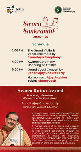 ಮಂಗಳೂರು : ಪ್ರಸಿದ್ದ ಸಂಗೀತ ಸಂಸ್ಥೆ ಸ್ವರಲಯ ಸಾಧನಾ ಫೌಂಡೇಶನ್ ಹಾಗೂ ಕಲಾ ಶಾಲೆ ವತಿಯಿಂದ ದಿನಾಂಕ 14 ಜನವರಿ 2026ರಂದು ಮಂಗಳೂರಿನ ಪುರಭವನದಲ್ಲಿ ಆಯೋಜನೆಗೊಳ್ಳಲಿರುವ ಸ್ವರ ಸಂಕ್ರಾಂತಿ ಕಾರ್ಯಕ್ರಮದಲ್ಲಿ ದೇಶದ ಖ್ಯಾತ ಹಿಂದೂಸ್ಥಾನಿ ಗಾಯಕ, ಪದ್ಮಶ್ರೀ ಪಂಡಿತ್ ಅಜೋಯ್ ಚಕ್ರವರ್ತಿ ಇವರಿಂದ ‘ಸ್ವರ ಸಂಧ್ಯಾ’ ಸಂಗೀತ ಕಛೇರಿ ನಡೆಯಲಿದೆ.