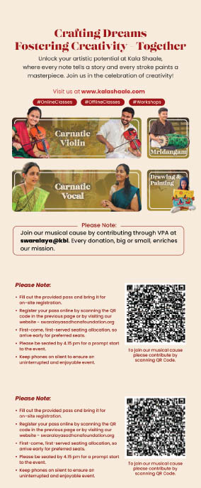 ಮಧ್ಯಾಹ್ನ 2-00 ಗಂಟೆಗೆ ಸ್ವರ ಸಂಕ್ರಾಂತಿ ಕಾರ್ಯಕ್ರಮ ಆರಂಭವಾಗಲಿದ್ದು, ಮೊದಲಿಗೆ ಕಲಾ ಶಾಲೆಯ 100ಕ್ಕೂ ಅಧಿಕ ವಿದ್ಯಾರ್ಥಿಗಳಿಂದ ಏಕಕಾಲದಲ್ಲಿ ‘ಸ್ವರಲಯ ಸಿಂಫೋನಿ’ ವಯೋಲಿನ್ ಕಛೇರಿ ನಡೆಯಲಿದೆ. ಸಂಜೆ 4-00 ಗಂಟೆಗೆ ಸಭಾ ಕಾರ್ಯಕ್ರಮ ನಡೆಯಲಿದ್ದು, ಸಂಜೆ 5-00 ಗಂಟೆ ಬಳಿಕ ಪಂಡಿತ್ ಅಜೋಯ್ ಚಕ್ರವರ್ತಿ ಇವರ ‘ಸ್ವರ ಸಂಧ್ಯಾ’ ಕಛೇರಿ ನಡೆಯಲಿದೆ.