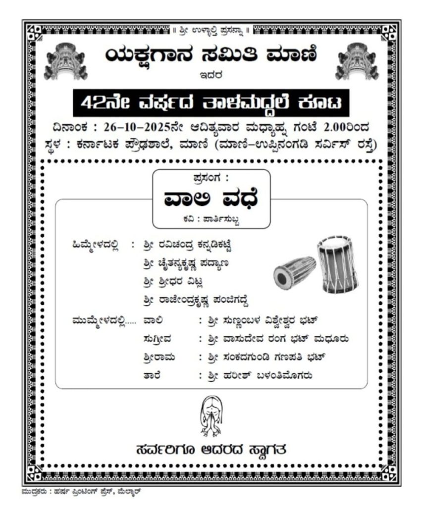 ಮಾಣಿ : ಯಕ್ಷಗಾನ ಸಮಿತಿ ಮಾಣಿ ಇದರ 42ನೇ ವರ್ಷದ ತಾಳಮದ್ದಲೆ ಕೂಟವನ್ನು ದಿನಾಂಕ 26 ಅಕ್ಟೋಬರ್ 2025ರಂದು ಮಧ್ಯಾಹ್ನ 2-00 ಗಂಟೆಗೆ ಮಾಣಿ ಕರ್ನಾಟಕ ಪ್ರೌಢ ಶಾಲೆಯಲ್ಲಿ ಆಯೋಜಿಸಲಾಗಿದೆ.