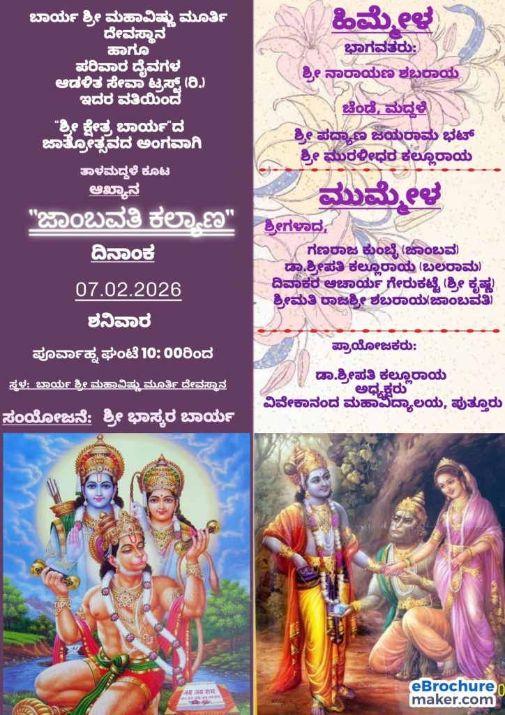 ಪುತ್ತೂರು : ಬಾರ್ಯ ಶ್ರೀ ಮಹಾವಿಷ್ಣು ಮೂರ್ತಿ ದೇವಸ್ಥಾನ ಹಾಗೂ ಪರಿವಾರ ದೈವಗಳ ಆಡಳಿತ ಸೇವಾ ಟ್ರಸ್ಟ್ (ರಿ.) ಇದರ ವತಿಯಿಂದ ಜಾತ್ರೋತ್ಸವದ ಅಂಗವಾಗಿ ತಾಳಮದ್ದಳೆ ಕೂಟವು ದಿನಾಂಕ 07 ಫೆಬ್ರವರಿ 2026ರಂದು ಪೂರ್ವಾಹ್ನ 10-00 ಗಂಟೆಗೆ ಶ್ರೀ ಕ್ಷೇತ್ರ ಬಾರ್ಯದಲ್ಲಿ ನಡೆಯಲಿದೆ.