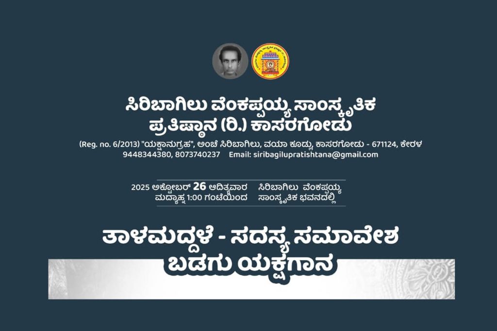 ಕಾಸರಗೋಡು : ಸಿರಿಬಾಗಿಲು ವೆಂಕಪ್ಪಯ್ಯ ಸಾಂಸ್ಕೃತಿಯ ಪ್ರತಿಷ್ಠಾನದ ಸಾಂಸ್ಕೃತಿಕ ಭವನದಲ್ಲಿ ದಿನಾಂಕ 26 ಅಕ್ಟೋಬರ್ 2025ರ ಆದಿತ್ಯವಾರದಂದು ಮಧ್ಯಾಹ್ನ 1-00ಗೆ ಶ್ರೀ ಜಯರಾಮ ದೇವಸ್ಯ ಬಳಗದಿಂದ ಯಕ್ಷಗಾನ ತಾಳಮದ್ದಳೆ, ತದನಂತರ ಸದಸ್ಯ ಸಮಾವೇಶ ಜರಗಲಿದೆ.