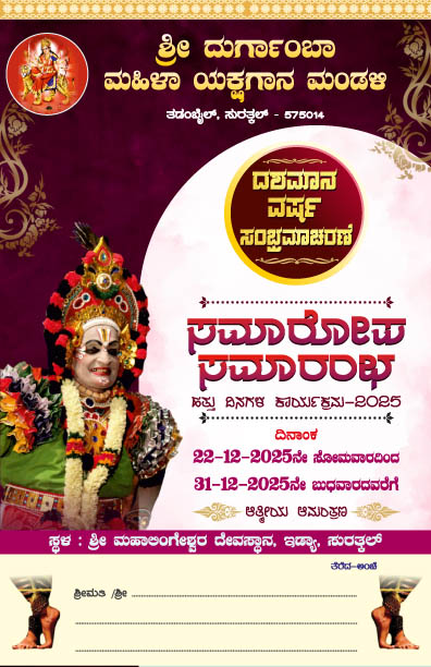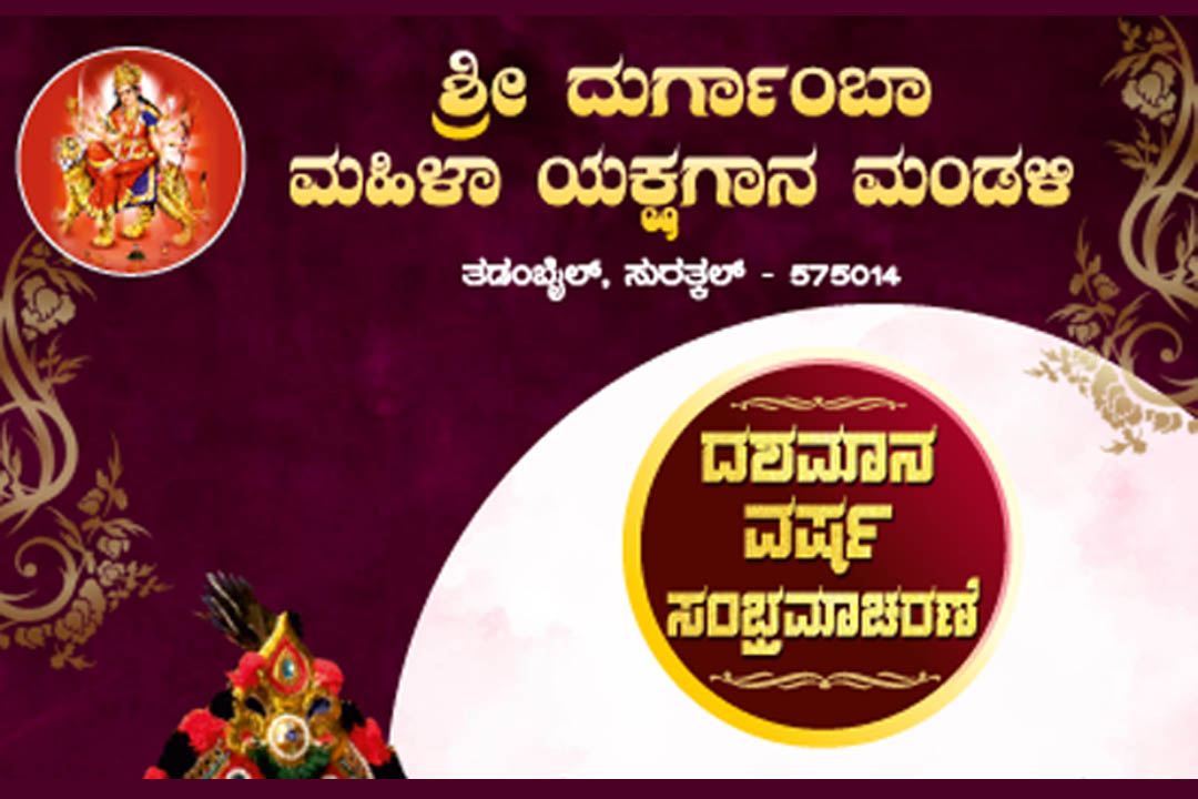 ಮಂಗಳೂರು : ಸುರತ್ಕಲ್ ತಡಂಬೈಲ್ ಇಲ್ಲಿರುವ ಶ್ರೀ ದುರ್ಗಾಂಬಾ ಮಹಿಳಾ ಯಕ್ಷಗಾನ ಮಂಡಳಿ ಇದರ ‘ದಶಮಾನ ವರ್ಷ ಸಂಭ್ರಮಾಚರಣೆ’ ಸಮಾರೋಪ ಸಮಾರಂಭ ಹತ್ತು ದಿನಗಳ ಕಾರ್ಯಕ್ರಮವನ್ನು ದಿನಾಂಕ 22ರಿಂದ 31 ಡಿಸೆಂಬರ್ 2025ರವರೆಗೆ ಪ್ರತಿ ದಿನ ಸಂಜೆ 4-00 ಗಂಟೆಗೆ ಇಡ್ಯಾ ಶ್ರೀ ಮಹಾಲಿಂಗೇಶ್ವರ ದೇವಸ್ಥಾನದಲ್ಲಿ ಹಮ್ಮಿಕೊಳ್ಳಲಾಗಿದೆ.