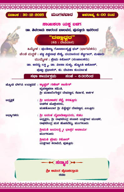 ದಿನಾಂಕ 30 ಡಿಸೆಂಬರ್ 2025ರಂದು ಪುತ್ತೂರು ಡಾ. ಶಿವರಾಮ ಕಾರಂತ ಬಾಲವನದ ಸಾಯಿಕಲಾ ಯಕ್ಷ ಬಳಗದವರಿಂದ ಕವಿ ದೇವಿದಾಸ ವಿರಚಿತ ‘ದಕ್ಷಾಧ್ವರ’ ತಾಳಮದ್ದಲೆ ಪ್ರಸ್ತುತಗೊಳ್ಳಲಿದೆ. ಶ್ರೀ ವಿಶ್ವೇಶ್ವರ ದೇವಸ್ಥಾನದ ಆಡಳಿತ ಮೊಕ್ತೇಸರರಾದ ಅರುಣಾಕರ ಶೆಟ್ಟಿ ಇವರ ಅಧ್ಯಕ್ಷತೆಯಲ್ಲಿ ನಡೆಯುವ ಸಭಾ ಕಾರ್ಯಕ್ರಮದಲ್ಲಿ ಅನಂತ ಬೈಪಾಡಿತ್ತಾಯ ಇವರನ್ನು ಸನ್ಮಾನಿಸಲಾಗುವುದು.