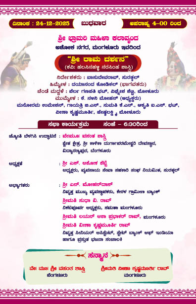 ದಿನಾಂಕ 24 ಡಿಸೆಂಬರ್ 2025ರಂದು ಮಂಗಳೂರು ಅಶೋಕ ನಗರ ಶ್ರೀ ಭ್ರಾಮರಿ ಮಹಿಳಾ ಕಲಾವೃಂದದವರಿಂದ ಕವಿ ಹಲಸಿನಹಳ್ಳಿ ನರಸಿಂಹ ಶಾಸ್ತ್ರಿ ವಿರಚಿತ ‘ಶ್ರೀ ರಾಮ ದರ್ಶನ’ ತಾಳಮದ್ದಲೆ ಪ್ರಸ್ತುತಗೊಳ್ಳಲಿದೆ. ಸುರತ್ಕಲ್ ವ್ಯವಸಾಯ ಸೇವಾ ಸಹಕಾರಿ ಸಂಘ ನಿಯಮಿತ ಇದರ ಅಧ್ಯಕ್ಷರಾದ ಎಸ್. ಅಶೋಕ ಶೆಟ್ಟಿ ಇವರ ಅಧ್ಯಕ್ಷತೆಯಲ್ಲಿ ನಡೆಯುವ ಸಭಾ ಕಾರ್ಯಕ್ರಮದಲ್ಲಿ ವೇದಮೂರ್ತಿ ವಸಂತ ಶಾಸ್ತ್ರಿ ಮತ್ತು ಶ್ರೀಮತಿ ವೀಣಾ ಕೃಷ್ಣಮೂರ್ತಿ ರಾವ್ ಇವರನ್ನು ಸನ್ಮಾನಿಸಲಾಗುವುದು.