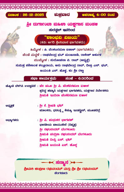 ದಿನಾಂಕ 26 ಡಿಸೆಂಬರ್ 2025ರಂದು ಸುರತ್ಕಲ್ ಶ್ರೀ ದುರ್ಗಾಂಬಾ ಮಹಿಳಾ ಯಕ್ಷಗಾನ ಮಂಡಳಿಯವರಿಂದ ಕವಿ ಅಗರಿ ಶ್ರೀನಿವಾಸ ಭಾಗವತರು ವಿರಚಿತ ‘ಶಾಂಭವಿ ವಿಜಯ’ ತಾಳಮದ್ದಲೆ ಪ್ರಸ್ತುತಗೊಳ್ಳಲಿದೆ. ಮೂಡಬಿದ್ರೆ ಧನಲಕ್ಷ್ಮಿ ಕೇಶ್ಯೂ ಇಂಡಸ್ಟ್ರೀಸ್ ಇದರ ಮಾಲಕರಾದ ಕೆ. ಶ್ರೀಪತಿ ಭಟ್ ಇವರ ಅಧ್ಯಕ್ಷತೆಯಲ್ಲಿ ನಡೆಯುವ ಸಭಾ ಕಾರ್ಯಕ್ರಮದಲ್ಲಿ ಶ್ರೀಮತಿ ಚಂದ್ರಿಕಾ ರಘುನಂದನ್ ಮತ್ತು ಶ್ರೀ ರಘುನಂದನ್ ಇವರನ್ನು ಸನ್ಮಾನಿಸಲಾಗುವುದು.