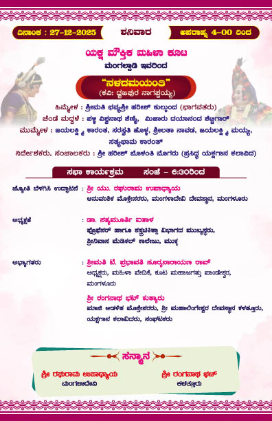 ದಿನಾಂಕ 27 ಡಿಸೆಂಬರ್ 2025ರಂದು ಮಂಗಲ್ಪಾಡಿ ಯಕ್ಷ ಮೌಕ್ತಿಕ ಮಹಿಳಾ ಕೂಟದವರಿಂದ ಕವಿ ದ್ವಜಪುರ ನಾಗಪ್ಪಯ್ಯ ವಿರಚಿತ ‘ನಳದಮಯಂತಿ’ ತಾಳಮದ್ದಲೆ ಪ್ರಸ್ತುತಗೊಳ್ಳಲಿದೆ. ಪ್ರೊಫೆಸರ್ ಸತ್ಯಮೂರ್ತಿ ಐತಾಳ ಇವರ ಅಧ್ಯಕ್ಷತೆಯಲ್ಲಿ ನಡೆಯುವ ಸಭಾ ಕಾರ್ಯಕ್ರಮದಲ್ಲಿ ರಘುರಾಮ ಉಪಾಧ್ಯಾಯ ಮತ್ತು ಶ್ರೀ ರಂಗನಾಥ ಭಟ್ ಇವರನ್ನು ಸನ್ಮಾನಿಸಲಾಗುವುದು.