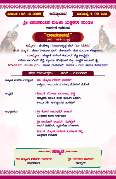 ದಿನಾಂಕ 28 ಡಿಸೆಂಬರ್ 2025ರಂದು ಕಾರ್ಕಳ ಶ್ರೀ ಅನಂತ ಶಯನ ಮಹಿಳಾ ಯಕ್ಷಕಲಾ ಮಂಡಳಿಯವರಿಂದ ಕವಿ ಪಾರ್ತಿಸುಬ್ಬ ವಿರಚಿತ ‘ರಾವಣ ವಧೆ’ ತಾಳಮದ್ದಲೆ ಪ್ರಸ್ತುತಗೊಳ್ಳಲಿದೆ. ಬಂಟರ ಸಂಘ ಮಹಿಳಾ ವಿಭಾಗದ ಅಧ್ಯಕ್ಷರಾದ ಶ್ರೀಮತಿ ಸರೋಜ ತಾರಾನಾಥ ಶೆಟ್ಟಿ ಇವರ ಅಧ್ಯಕ್ಷತೆಯಲ್ಲಿ ನಡೆಯುವ ಸಭಾ ಕಾರ್ಯಕ್ರಮದಲ್ಲಿ ಡಾ. ಜ್ಯೋತಿ ಗಣೇಶ್ ಕಾರ್ಣಿಕ್ ಮತ್ತು ಶ್ರೀ ಉಮೇಶ ಅಂಚನ್ ಇವರನ್ನು ಸನ್ಮಾನಿಸಲಾಗುವುದು.