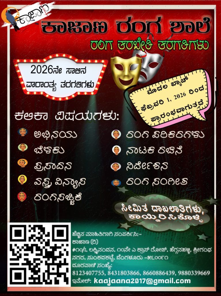 ಬೆಂಗಳೂರು : ಕಾಜಾಣ ರಂಗ ಶಾಲೆ ಇದರ ವತಿಯಿಂದ ರಂಗ ತರಬೇತಿ ತರಗತಿಗಳು ದಿನಾಂಕ 01 ಫೆಬ್ರುವರಿ 2026ರಂದು ಮೊದಲ ಬ್ಯಾಚ್ ಪ್ರಾರಂಭವಾಗಲಿದೆ. 2026ನೇ ಸಾಲಿನ ವಾರಾಂತ್ಯ ತರಗತಿಯಲ್ಲಿ ಅಭಿನಯ, ಬೆಳಕು, ಪ್ರಸಾದನ, ವಸ್ತ್ರ ವಿನ್ಯಾಸ, ರಂಗಸಜ್ಜಿಕೆ, ರಂಗ ಪರಿಕರಗಳು, ನಾಟಕ ರಚನೆ, ನಿರ್ದೇಶನ ಮತ್ತು ರಂಗ ಸಂಗೀತ ಮುಂತಾದ ಕಲಿಕಾ ವಿಷಯಗಳಲ್ಲಿ ಮಾಹಿತಿ ನೀಡಲಾಗುವುದು. ಹೆಚ್ಚಿನ ಮಾಹಿತಿಗಾಗಿ 8123407755, 8431803866, 8660886439 ಮತ್ತು 9880339669 ಸಂಖ್ಯೆಗಳನ್ನು ಸಂಪರ್ಕಿಸಿರಿ.