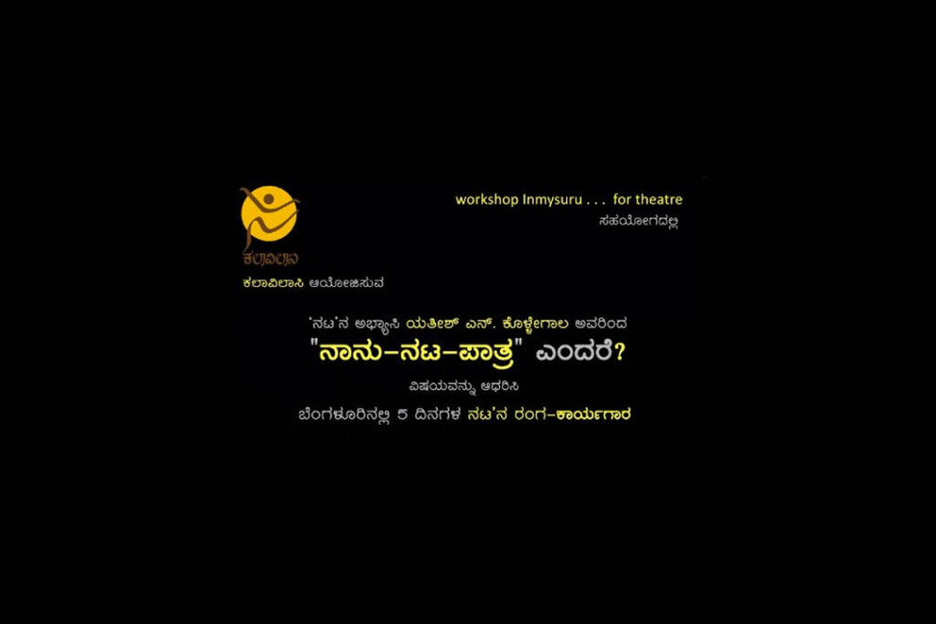 ಬೆಂಗಳೂರು : ಬೆಂಗಳೂರಿನ ‘ಕಲಾವಿಲಾಸಿ’ ಆಯೋಜಿಸುವ “ನಾನು-ನಟ-ಪಾತ್ರ” ಎಂದರೆ? ವಿಷಯವನ್ನು ಆಧರಿಸಿ 5 ದಿನಗಳ ರಂಗ ನಟನಾ ಕಾರ್ಯಗಾರ ನಿರ್ದೇಶಕ ಯತೀಶ್ ಎನ್. ಕೊಳ್ಳೇಗಾಲ ಇವರ ನಿರ್ದೇಹಸನದಲ್ಲಿ ದಿನಾಂಕ 05-11-2023 ರಿಂದ 09-11-2023ರ ವರೆಗೆ ಬೆಂಗಳೂರಿನಲ್ಲಿ ಜಯನಗರದಲ್ಲಿ ನಡೆಯಲಿದೆ. ಈ ಕಾರ್ಯಗಾರದಲ್ಲಿ ಭಾಗಿಯಾದವರಿಗೆ ಅದರ ಮುಂದಿನ ಭಾಗವಾಗಿ ಹೊಸ ನಾಟಕದಲ್ಲಿ ತೊಡಗಿಸಿಕೊಳ್ಳುವ ಅವಕಾಶವಿರುತ್ತದೆ.