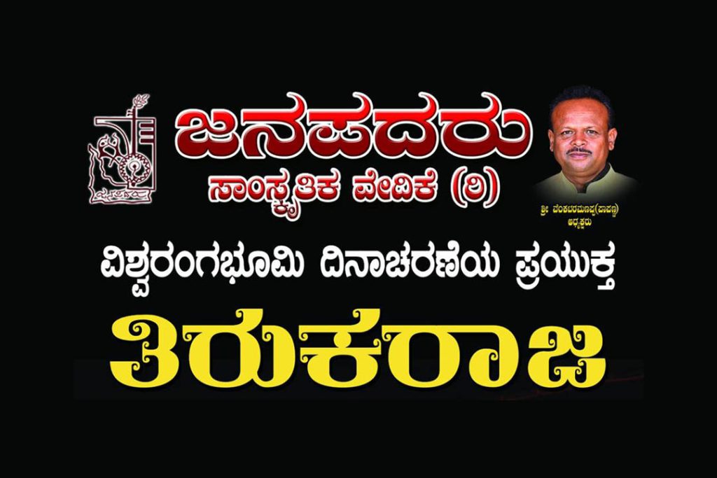 ಬೆಂಗಳೂರು : ವಿಶ್ವ ರಂಗಭೂಮಿ ದಿನಾಚರಣೆ ಪ್ರಯುಕ್ತ ಜನಪದರು ಸಾಂಸ್ಕೃತಿಕ ವೇದಿಕೆ (ರಿ.) ಇವರು ಅಭಿನಯಿಸುವ ರಾಮಕೃಷ್ಣ ಬೆಳ್ತೂರು ಇವರ ನಿರ್ದೇಶನದಲ್ಲಿ ‘ತಿರುಕರಾಜ’ ನಾಟಕ ಪ್ರದರ್ಶನವನ್ನು ದಿನಾಂಕ 27 ಮಾರ್ಚ್ 2025ರಂದು ಬೆಂಗಳೂರಿನ ನಿಂಬೆಕಾಯಿಪುರದ ಶ್ರೀ ಅಭಯಾಂಜನೇಯ ಸ್ವಾಮಿ ದೇವಾಲಯದ ಆವರಣದಲ್ಲಿರುವ ಜನಪದರು ರಂಗಮಂದಿರದಲ್ಲಿ ಹಮ್ಮಿಕೊಳ್ಳಲಾಗಿದೆ.