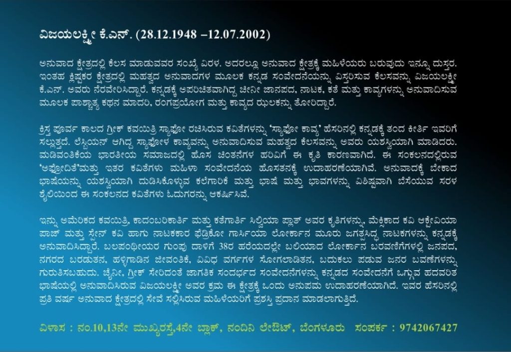ಬೆಂಗಳೂರು : ಸಂಸ ಥಿಯೇಟರ್ ಬೆಂಗಳೂರು ಇವರ ವತಿಯಿಂದ ಕನ್ನಡ ಮತ್ತು ಸಂಸ್ಕೃತಿ ಇಲಾಖೆ ಇವರ ಸಹಕಾರದೊಂದಿಗೆ ಕೆ.ಎನ್. ವಿಜಯಲಕ್ಷ್ಮಿ ಅನುವಾದ ಕವಿಗೋಷ್ಠಿ ಮತ್ತು ಪ್ರಶಸ್ತಿ ಪ್ರದಾನ ಸಮಾರಂಭವನ್ನು ದಿನಾಂಕ 14 ಡಿಸೆಂಬರ್ 2025ರಂದು ಸಂಜೆ 4-00 ಗಂಟೆಗೆ ಬೆಂಗಳೂರಿನ ಜೆ.ಸಿ. ರಸ್ತೆಯಲ್ಲಿರುವ ಕನ್ನಡ ಭವನದ ನಯನ ರಂಗಮಂದಿರದಲ್ಲಿ ಆಯೋಜಿಸಲಾಗಿದೆ.