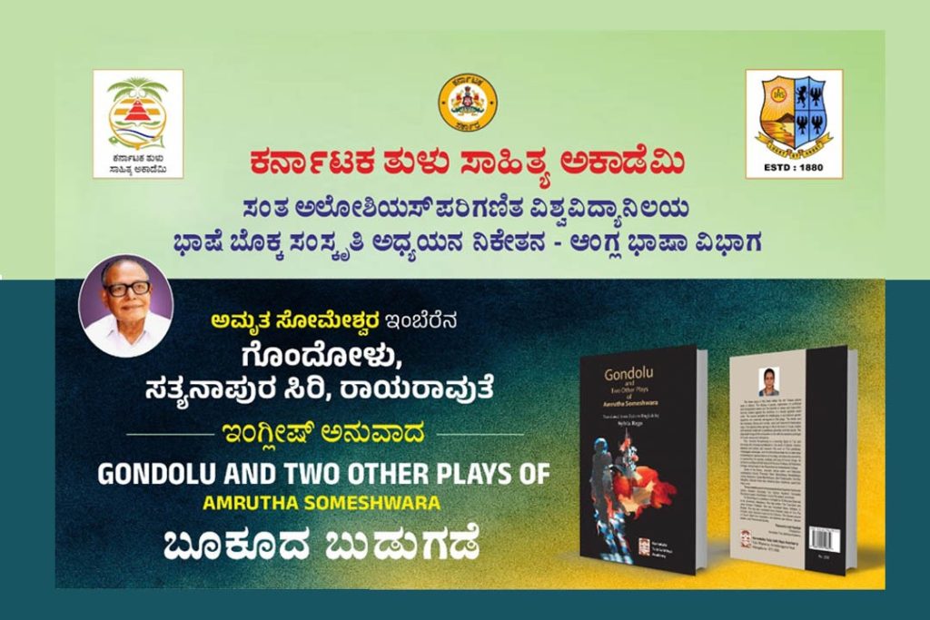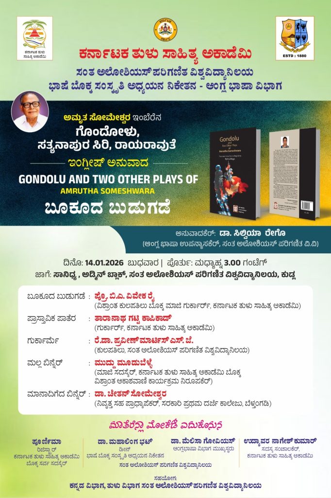 ಅಮೃತ ಸೋಮೇಶ್ವರ ಇವರ ಗೊಂದೋಳು, ಸತ್ಯನಾಪುರ ಸಿರಿ, ರಾಯ ರಾವುತೆ ಈ ಮೂರು ನಾಟಕ ಕೃತಿಯನ್ನು ಅಲೋಶಿಯಸ್ ವಿವಿಯ ಆಂಗ್ಲ ಭಾಷಾ ಉಪನ್ಯಾಸಕಿ ಡಾ. ಸಿಲ್ವಿಯಾ ರೇಗೊ ಇವರು ಇಂಗ್ಲೀಷ್ಗೆ ಅನುವಾದಿಸಿರುತ್ತಾರೆ. ವಿಶ್ರಾಂತ ಕುಲಪತಿಗಳಾದ ಡಾ. ಬಿ.ಎ. ವಿವೇಕ ರೈ ಇವರು ಕೃತಿ ಬಿಡುಗಡೆ ಮಾಡಲಿದ್ದು, ಸಂತ ಅಲೋಶಿಯಸ್ ಪರಿಗಣಿತ ವಿಶ್ವವಿದ್ಯಾಲಯದ ಕುಲಪತಿ ಡಾ. ಪ್ರವೀಣ್ ಮಾರ್ಟಿಸ್ ಎಸ್.ಜೆ. ಇವರು ಕಾರ್ಯಕ್ರಮದ ಅಧ್ಯಕ್ಷತೆ ವಹಿಸಲಿದ್ದಾರೆ. ತುಳು ಸಾಹಿತ್ಯ ಅಕಾಡೆಮಿ ಅಧ್ಯಕ್ಷ ತಾರಾನಾಥ ಗಟ್ಟಿ ಕಾಪಿಕಾಡ್ ಪ್ರಾಸ್ತಾವಿಕ ಮಾತುಗಳನ್ನಾಡುವರು. ವಿಶ್ರಾಂತ ಆಕಾಶವಾಣಿ ಕಾರ್ಯಕ್ರಮ ನಿರೂಪಕ ಮುದ್ದು ಮೂಡುಬೆಳ್ಳೆ, ನಿವೃತ್ತ ಸಹ ಪ್ರಾಧ್ಯಾಪಕ ಡಾ. ಚೇತನ್ ಸೋಮೇಶ್ವರ ಮುಖ್ಯ ಅತಿಥಿಯಾಗಿ ಭಾಗವಹಿಸುವರು.