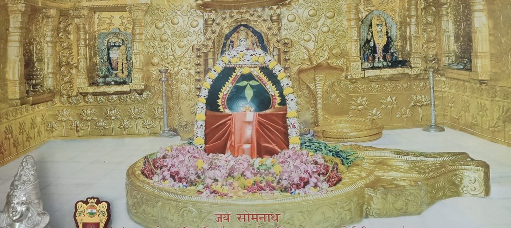 ಇಲ್ಲಿ ಬಿಗಿಯಾದ ಬಂದೋಬಸ್ತು ಇದೆ. ಮೂರು ಕಡೆ ಪ್ರವಾಸಿಗರ ತಪಾಸಣೆ ಮಾಡುತ್ತಾರೆ. ಮೊಬೈಲ್ ಮತ್ತು ಬ್ಯಾಗ್ ಗಳನ್ನು ಒಯ್ಯುವಂತಿಲ್ಲ. ದೇವಸ್ಥಾನದ ತನಕ ವಾಹನದಲ್ಲಿ ಹೋಗುವಂತಿಲ್ಲ. ಕಿಲೋಮೀಟರ್ ವರೆಗೆ ನಡೆದೇ ಹೋಗಬೇಕು. ಬಹುಶಃ ಭಾರತದ ಬೇರಾವ ಕ್ಷೇತ್ರಗಳಲ್ಲೂ ಇಲ್ಲದ ಬಹಳ ವಿಶಾಲವಾದ ಆವರಣ. ದೂರದಿಂದಲೇ ಝಗಮಗಿಸುತ್ತ ಕಣ್ಣು ಕೋರೈಸುತ್ತಿದ್ದ ಭವ್ಯವಾದ ದೇಗುಲವನ್ನು ಕಂಡು ನಾವು ಆನಂದತುಂದಿಲರಾದೆವು. ಶಿಲಾಮಯ ದೇಗುಲ. ಗರ್ಭಗುಡಿ ಸ್ವರ್ಣಮಯ. ವಾಸ್ತು ಶಿಲ್ಪ ವಿನ್ಯಾಸಗಳ ಸೌಂದರ್ಯಕ್ಕೆಣೆಯಿಲ್ಲ. ಆದರೇನು? ಒಳಗೆ ನಿಂತು ನೋಡುತ್ತ ಮೈಮರೆಯುವ ಅವಕಾಶವಿಲ್ಲ. ಒಂದು ಕ್ಷಣದ ನೋಟ. ಆಮೇಲೆ ನಮ್ಮನ್ನು ಓಡಿಸುತ್ತಾರೆ. ನಾವು ಹೊರಗಿನ ಹುಲ್ಲುಹಾಸಿನ ಮೇಲೆ ಕುಳಿತು ಶಿಲ್ಪಕಲಾ ವೈಭವವನ್ನು ವೀಕ್ಷಿಸುತ್ತಾ ಆಸ್ವಾದಿಸುತ್ತಾ ಶಿಕಾರಿಪುರ ಸರ್ ಹೇಳಿಕೊಟ್ಟ ಮಂತ್ರಗಳನ್ನು ಜಪಿಸುತ್ತ ಸೋಮನಾಥನಿಗೆ ನಮ್ಮ ಪ್ರಾರ್ಥನೆ ಸಲ್ಲಿಸಿ ನಮ್ಮ ಬೇಡಿಕೆಗಳನ್ನು ನಿವೇದಿಸಿಕೊಂಡೆವು. ಅಷ್ಟು ಹೊತ್ತಿಗೆ ಜನನಿಬಿಡತೆ ತುಸು ಕಡಿಮೆಯಾಗಿದ್ದನ್ನು ಗಮನಿಸಿ ಇನ್ನೊಮ್ಮೆ ಒಳಗೆ ಹೋಗಿ ದೇವರ ದರ್ಶನ ಮಾಡಿ ಬಂದೆವು. ಅನಂತರ ಸುಮಾರು 200 ಮೀಟರ್ ಅಷ್ಟೇ ದೂರದಲ್ಲಿ ಭೋರ್ಗರೆಯುತ್ತಿರುವ ಸಮುದ್ರರಾಜನ ಬಳಿಗೆ ಹೋಗಿ ಸ್ವಲ್ಪ ಹೊತ್ತು ಕುಳಿತು ಬಂದೆವು.