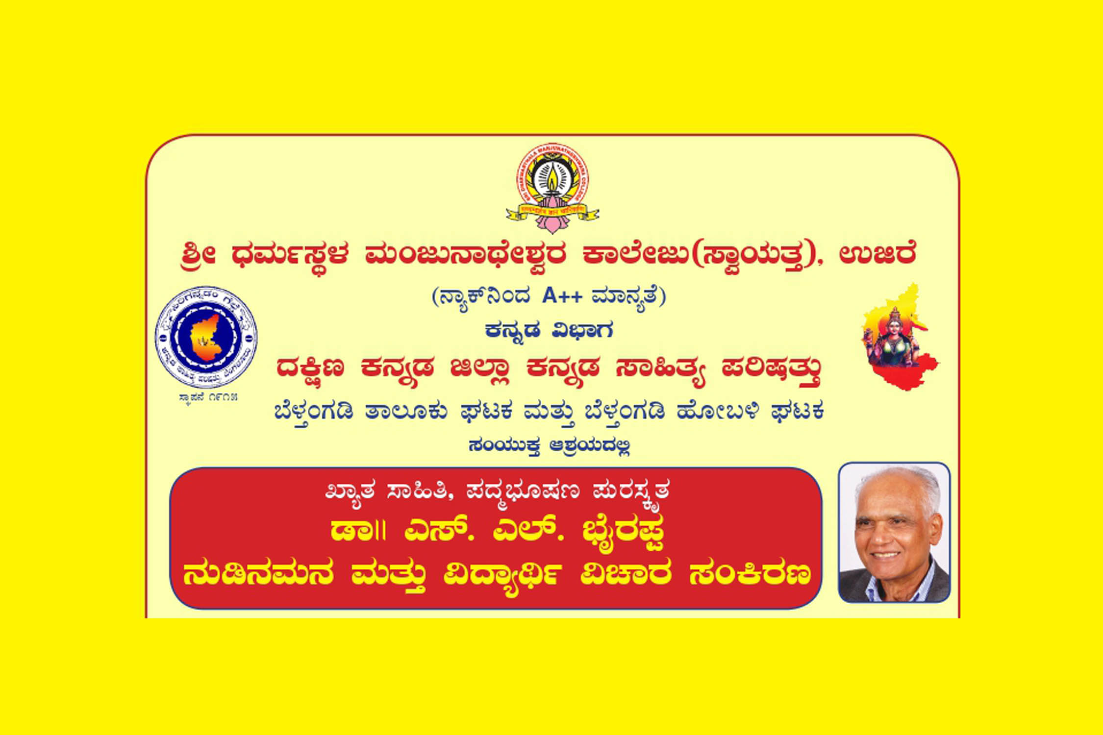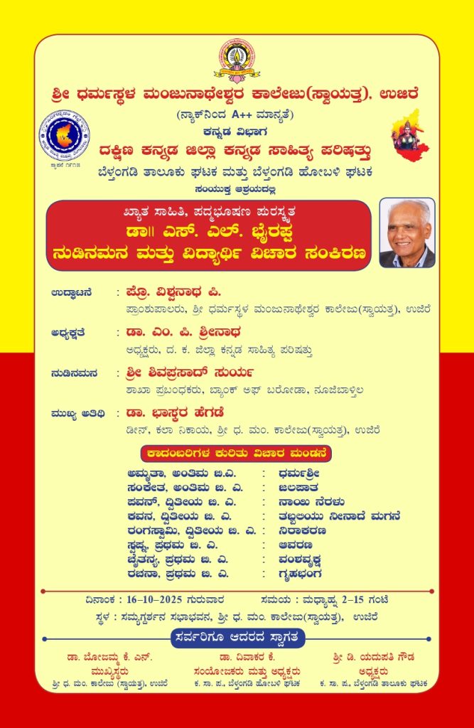 ಉಜಿರೆ : ಶ್ರೀ ಧರ್ಮಸ್ಥಳ ಮಂಜುನಾಥೇಶ್ವರ ಕಾಲೇಜು (ಸ್ವಾಯತ್ತ) ಉಜಿರೆ ಕನ್ನಡ ವಿಭಾಗ ಮತ್ತು ದಕ್ಷಿಣ ಕನ್ನಡ ಜಿಲ್ಲಾ ಕನ್ನಡ ಸಾಹಿತ್ಯ ಪರಿಷತ್ತು ಬೆಳ್ತಂಗಡಿ ತಾಲೂಕು ಘಟಕ ಮತ್ತು ಬೆಳ್ತಂಗಡಿ ಹೋಬಳಿ ಘಟಕ ಇವರ ಸಂಯುಕ್ತ ಆಶ್ರಯದಲ್ಲಿ ಖ್ಯಾತ ಸಾಹಿತಿ ಪದ್ಮಭೂಷಣ ಪುರಸ್ಕೃತ ಡಾ. ಎಸ್.ಎಲ್. ಭೈರಪ್ಪ ನುಡಿನಮನ ಮತ್ತು ವಿದ್ಯಾರ್ಥಿ ವಿಚಾರ ಸಂಕಿರಣ ಕಾರ್ಯಕ್ರಮವನ್ನು ದಿನಾಂಕ 16 ಅಕ್ಟೋಬರ್ 2025ರಂದು ಮಧ್ಯಾಹ್ನ 2-15 ಗಂಟೆಗೆ ಉಜಿರೆ ಶ್ರೀ ಧರ್ಮಸ್ಥಳ ಮಂಜುನಾಥೇಶ್ವರ ಕಾಲೇಜಿನ ಸಮ್ಯಗ್ದರ್ಶನ ಸಭಾಭವನದಲ್ಲಿ ಹಮ್ಮಿಕೊಳ್ಳಲಾಗಿದೆ.