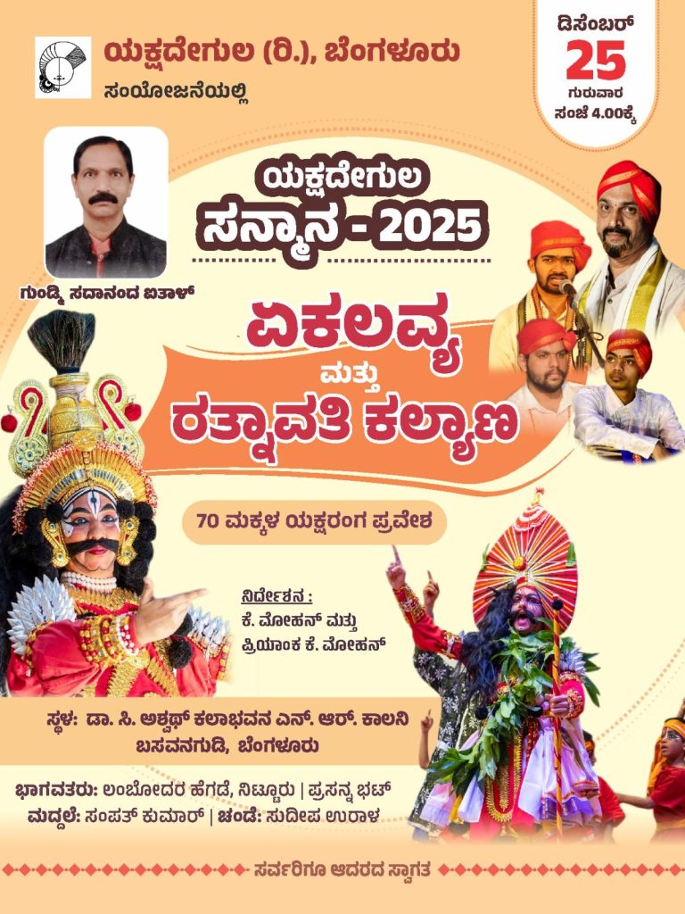 ಬೆಂಗಳೂರು : ಯಕ್ಷದೇಗುಲ (ರಿ.) ಬೆಂಗಳೂರು ಇವರ ಸಂಯೋಜನೆಯಲ್ಲಿ ‘ಯಕ್ಷದೇಗುಲ ಸನ್ಮಾನ – 2025’ ಮತ್ತು ಯಕ್ಷಗಾನ ಪ್ರದರ್ಶನವನ್ನು ದಿನಾಂಕ 25 ಡಿಸೆಂಬರ್ 2025ರಂದು ಸಂಜೆ 4-00 ಗಂಟೆಗೆ ಬೆಂಗಳೂರಿನ ಬಸವನಗುಡಿ ಎನ್.ಆರ್. ಕಾಲನಿಯಲ್ಲಿರುವ ಡಾ. ಸಿ. ಅಶ್ವಥ್ ಕಲಾಭವನದಲ್ಲಿ ಹಮ್ಮಿಕೊಳ್ಳಲಾಗಿದೆ.
