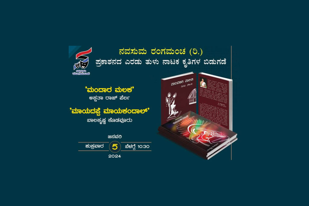 ಮಂಗಳೂರು : ನವಸುಮ ರಂಗಮಂಚ (ರಿ.) ಪ್ರಕಾಶನದಿಂದ ರಂಗಸಂಗಾತಿ ಸಾಂಸ್ಕೃತಿಕ ಪ್ರತಿಷ್ಠಾನದ ಸಹಕಾರದೊಂದಿಗೆ ಅಕ್ಷತಾ ರಾಜ್ ಪೆರ್ಲ ಇವರ ‘ಮಂದಾರ ಮಲಕ’ ಮತ್ತು ಬಾಲಕೃಷ್ಣ ಕೊಡವೂರು ಇವರ ‘ಮಾಯದಪ್ಪೆ ಮಾಯಕಂದಾಲ್’ ಎಂಬ ಎರಡು ತುಳು ನಾಟಕ ಕೃತಿಗಳ ಬಿಡುಗಡೆ ಕಾರ್ಯಕ್ರಮವು ಮಂಗಳೂರು ಪ್ರೆಸ್ ಕ್ಲಬ್ ಸಭಾಂಗಣದಲ್ಲಿ ದಿನಾಂಕ 05-01-2024ರಂದು ನಡೆಯಲಿದೆ.