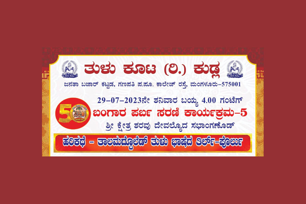 ಮಂಗಳೂರು : ತುಳು ಕೂಟ ಕುಡ್ಲ ಇದರ ‘ಬಂಗಾರ ಪರ್ಬ’ ಸರಣಿ ಕಾರ್ಯಕ್ರಮವು ಶ್ರೀ ಕ್ಷೇತ್ರ ಶರವು ದೇವಾಲಯದ ಸಭಾಂಗಣದಲ್ಲಿ ದಿನಾಂಕ 29-07-2023ನೇ ಶುಕ್ರವಾರ ಸಂಜೆ 4 ಗಂಟೆಗೆ ನಡೆಯಲಿದೆ.