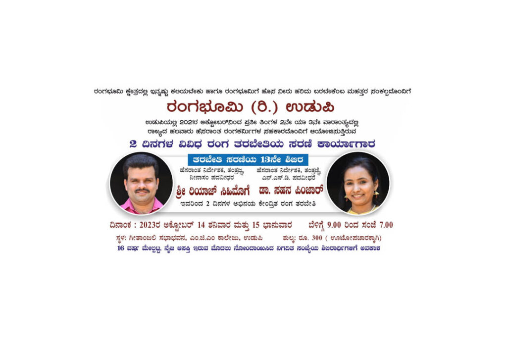ಉಡುಪಿ : ರಂಗಭೂಮಿ (ರಿ.) ಉಡುಪಿ ಆಯೋಜಿಸುತ್ತಿರುವ 2 ದಿನಗಳ ವಿವಿಧ ರಂಗ ತರಬೇತಿಯ ಸರಣಿ ಕಾರ್ಯಾಗಾರದ 13ನೇ ಶಿಬಿರವು