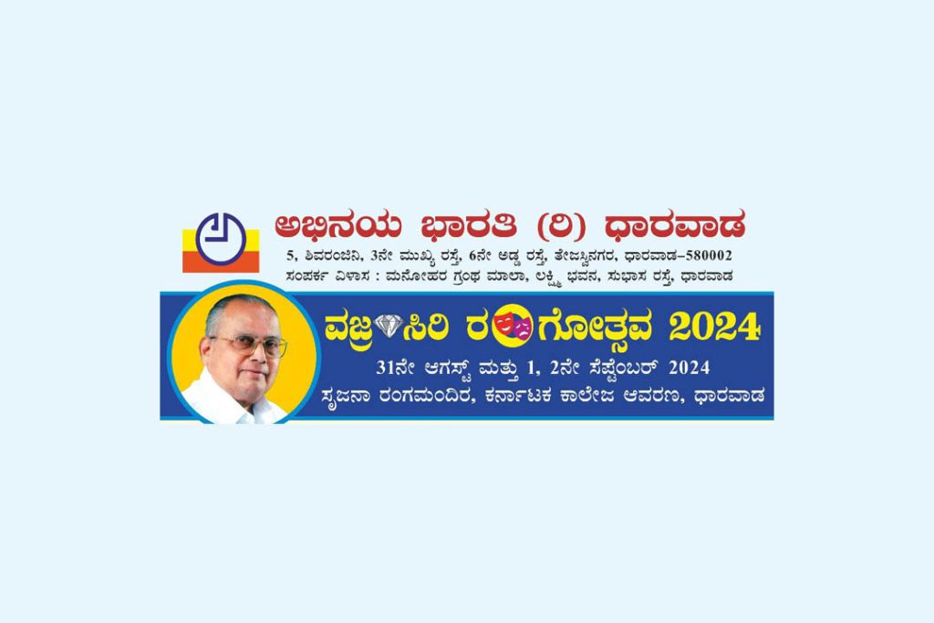 ಧಾರವಾಡ : ಉತ್ತರ ಕರ್ನಾಟಕದ ಜನಪ್ರಿಯ ರಂಗ ಸಂಸ್ಥೆಯಾದ ಅಭಿನಯ ಭಾರತಿ (ರಿ.) ಇದರ ವತಿಯಿಂದ ‘ವಜ್ರ ಸಿರಿ ರಂಗೋತ್ಸವ 2024’ ಕಾರ್ಯಕ್ರಮವನ್ನು ಧಾರವಾಡ ಕರ್ನಾಟಕ ಕಾಲೇಜಿನ ಆವರಣದ ಸೃಜನಾ ರಂಗಮಂದಿರದಲ್ಲಿ ದಿನಾಂಕ 31-08-2024ರಿಂದ 02-09-2024ರವರೆಗೆ ಸಂಜೆ 6-00 ಗಂಟೆಗೆ ಹಮ್ಮಿಕೊಂಡಿದೆ.