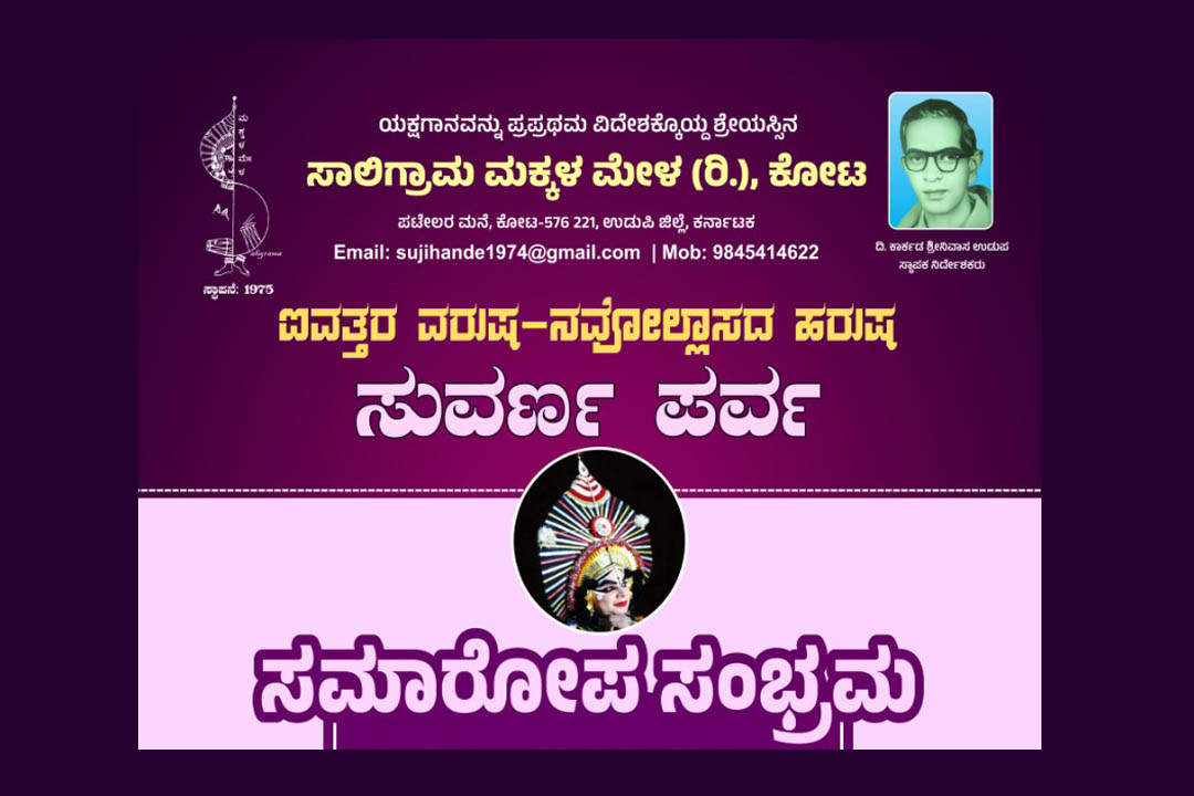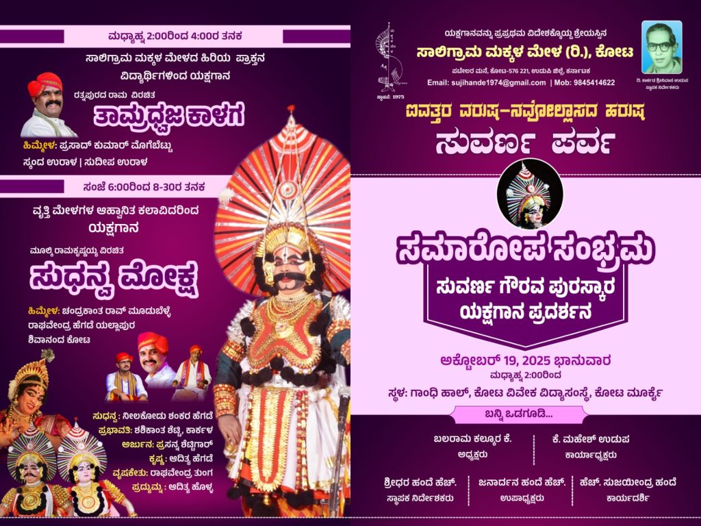 ಕೋಟ : ಸಾಲಿಗ್ರಾಮ ಮಕ್ಕಳ ಮೇಳ (ರಿ.) ಕೋಟ ಇದರ ಐವತ್ತರ ವರುಷ – ನವೋಲ್ಲಾಸದ ಹರುಷ ಪ್ರಯುಕ್ತ ನಡೆದ ಸುವರ್ಣ ಪರ್ವದ ಸಮಾರೋಪ ಸಂಭ್ರಮವನ್ನು ದಿನಾಂಕ 19 ಅಕ್ಟೋಬರ್ 2025ರಂದು ಮಧ್ಯಾಹ್ನ 2-00 ಗಂಟೆಗೆ ಕೋಟ ಮೂರ್ಕೈ ಕೋಟ ವಿವೇಕ ವಿದ್ಯಾ ಸಂಸ್ಥೆ ಗಾಂಧಿ ಹಾಲ್ ನಲ್ಲಿ ಹಮ್ಮಿಕೊಳ್ಳಲಾಗಿದೆ.