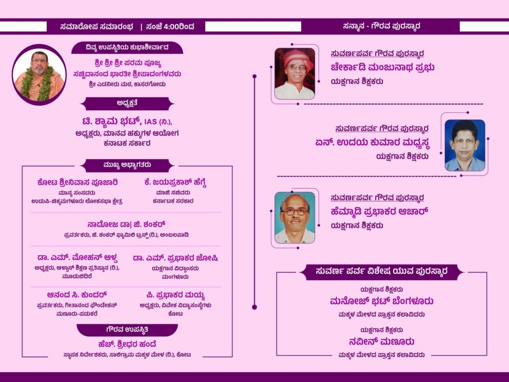ಸಾಲಿಗ್ರಾಮ ಮಕ್ಕಳ ಮೇಳದ ಹಿರಿಯ ಪ್ರಾಕ್ತನ ವಿದ್ಯಾರ್ಥಿಗಳಿಂದ ರತ್ನಪುರದ ರಾಮ ವಿರಚಿತ ‘ತಾಮ್ರಧ್ವಜ ಕಾಳಗ’ ಮತ್ತು ವೃತ್ತಿ ಮೇಳಗಳ ಆಹ್ವಾನಿತ ಕಲಾವಿದರಿಂದ ಮೂಲ್ಕಿ ರಾಮಕೃಷ್ಣಯ್ಯ ವಿರಚಿತ ‘ಸುಧನ್ವ ಮೋಕ್ಷ’ ಯಕ್ಷಗಾನ ಪ್ರದರ್ಶನ ನಡೆಯಲಿದೆ. ಸಂಜೆ 4-00 ಗಂಟೆಗೆ ಸಾಲಿಗ್ರಾಮ ಮಕ್ಕಳ ಮೇಳ (ರಿ.) ಕೋಟ ಇದರ ಸ್ಥಾಪಕ ನಿರ್ದೇಶಕರಾದ ಹೆಚ್. ಶ್ರೀಧರ ಹಂದೆ ಇವರ ಗೌರವ ಉಪಸ್ಥಿತಿಯಲ್ಲಿ ನಡೆಯಲಿರುವ ಸಮಾರೋಪ ಸಮಾರಂಭದ ಅಧ್ಯಕ್ಷತೆಯನ್ನು ಮಾನವ ಹಕ್ಕುಗಳ ಆಯೋಗದ ಅಧ್ಯಕ್ಷರಾದ ಟಿ. ಶ್ಯಾಮ ಭಟ್ ಇವರು ವಹಿಸಲಿದ್ದಾರೆ. ಮುಖ್ಯ ಅಭಾಗತರಾಗಿ ಮಾನ್ಯ ಸಂಸದರಾದ ಕೋಟ ಶ್ರೀನಿವಾಸ ಪೂಜಾರಿ, ಮಾಜಿ ಸಚಿವರಾದ ಕೆ. ಜಯಪ್ರಕಾಶ್ ಹೆಗ್ಡೆ, ಅಂಬಲಪಾಡಿ ಜಿ. ಶಂಕರ್ ಫ್ಯಾಮಿಲಿ ಟ್ರಸ್ಟ್ (ರಿ.) ಇದರ ಪ್ರವರ್ತಕರಾದ ನಾಡೋಜ ಡಾ. ಜಿ. ಶಂಕರ್, ಆಳ್ವಾಸ್ ಶಿಕ್ಷಣ ಪ್ರತಿಷ್ಠಾನ (ರಿ.) ಇದರ ಅಧ್ಯಕ್ಷರಾದ ಡಾ. ಎಮ್. ಮೋಹನ್ ಆಳ್ವ, ಯಕ್ಷಗಾನ ವಿದ್ವಾಂಸ ಡಾ. ಎಮ್. ಪ್ರಭಾಕರ ಜೋಷಿ, ಗೀತಾನಂದ ಫೌಂಡೇಷನ್ ಪ್ರವರ್ತಕರಾದ ಆನಂದ ಸಿ. ಕುಂದರ್ ಮತ್ತು ವಿವೇಕ ವಿದ್ಯಾ ಸಂಸ್ಥೆಗಳ ಅಧ್ಯಕ್ಷರಾದ ಪಿ. ಪ್ರಭಾಕರ ಮಯ್ಯ ಇವರುಗಳು ಭಾಗವಹಿಸಲಿದ್ದಾರೆ. ಇದೇ ಸಂದರ್ಭದಲ್ಲಿ ಯಕ್ಷಗಾನ ಶಿಕ್ಷಕರಾದ ಚೇರ್ಕಾಡಿ ಮಂಜುನಾಥ ಪ್ರಭು, ಎನ್. ಉದಯ ಕುಮಾರ ಮಧ್ಯಸ್ಥ ಮತ್ತು ಹೆಮ್ಮಾಡಿ ಪ್ರಭಾಕರ ಆಚಾರ್ ಇವರುಗಳಿಗೆ ‘ಸುವರ್ಣ ಪರ್ವ ಗೌರವ ಪುರಸ್ಕಾರ ಹಾಗೂ ಮನೋಜ್ ಭಟ್ ಬೆಂಗಳೂರು ಮತ್ತು ನವೀನ್ ಮಣೂರು ಇವರಿಗೆ ‘ಸುವರ್ಣ ಪರ್ವ ವಿಶೇಷ ಯುವ ಪುರಸ್ಕಾರ’ ನೀಡಿ ಸನ್ಮಾನಿಸಲಾಗುವುದು.