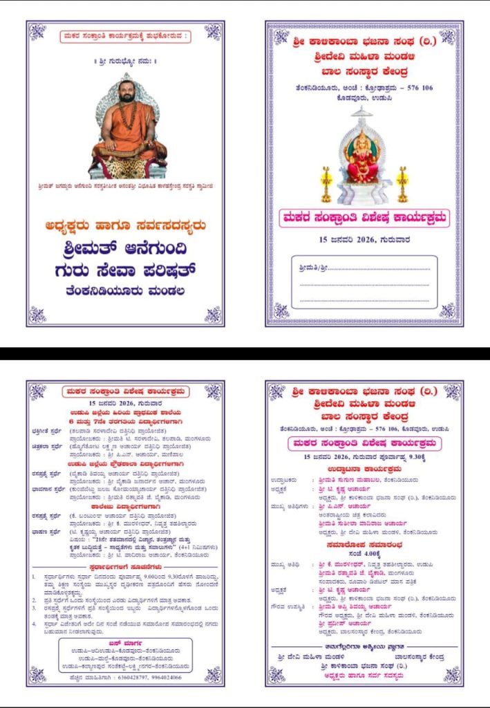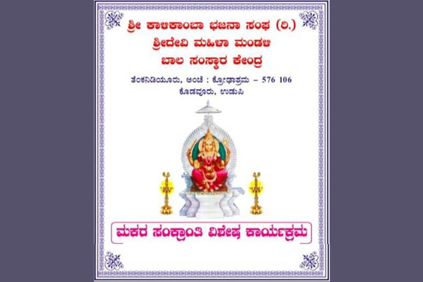 ಉಡುಪಿ : ಶ್ರೀ ಕಾಳಿಕಾಂಬಾ ಭಜನಾ ಸಂಘ, ಶ್ರೀದೇವಿ ಮಹಿಳಾ ಮಂಡಳಿ ಮತ್ತು ಬಾಲ ಸಂಸ್ಕಾರ ಕೇಂದ್ರ ಇವರ ವತಿಯಿಂದ ಮಕರ ಸಂಕ್ರಾಂತಿ ವಿಶೇಷ ಕಾರ್ಯಕ್ರಮವನ್ನು ದಿನಾಂಕ 15 ಜನವರಿ 2026ರಂದು ಉಡುಪಿ ತೆಂಕನಿಡಿಯೂರು ಇಲ್ಲಿ ಹಮ್ಮಿಕೊಳ್ಳಲಾಗಿದೆ.