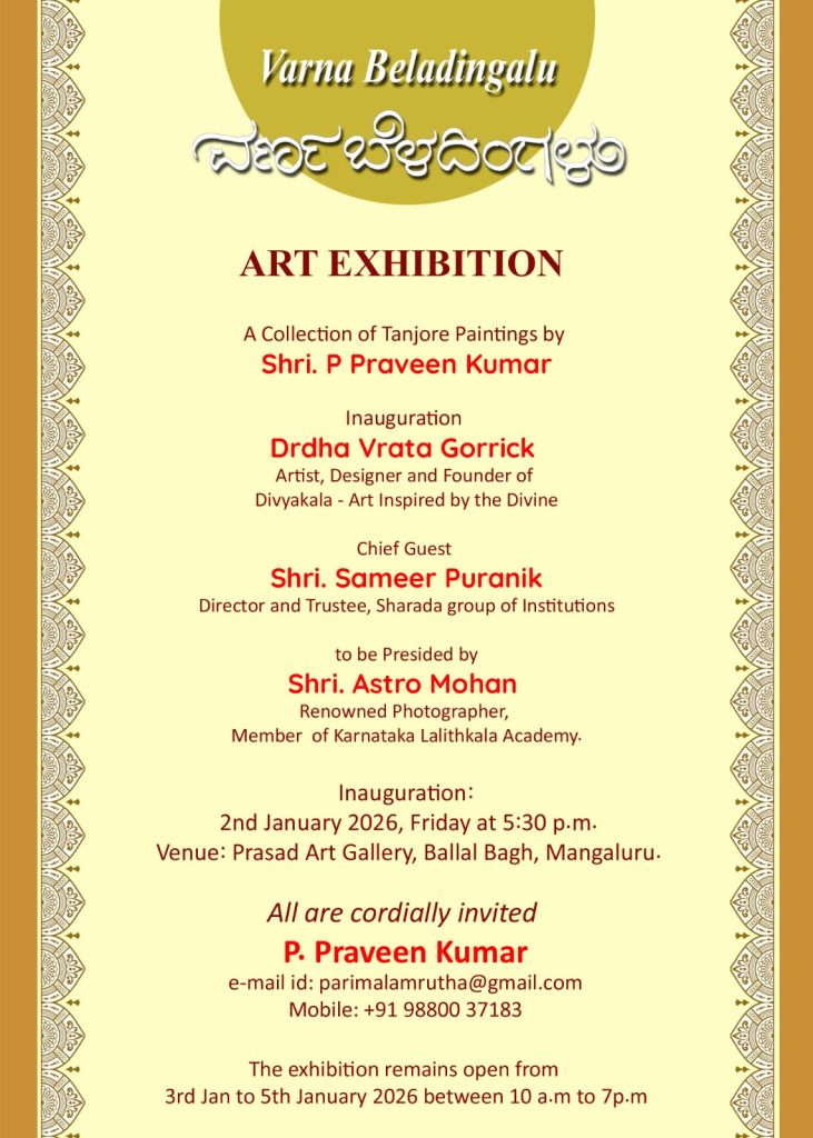 ದಿನಾಂಕ 02 ಜನವರಿ 2025ರಂದು ಸಂಜೆ ಗಂಟೆ 5-30ಕ್ಕೆ ದೃಢವ್ರತ ಗೊರಿಕ್‌ರವರು ಪ್ರದರ್ಶನ ಉದ್ಘಾಟಿಸಲಿದ್ದು, ಮುಖ್ಯ ಅತಿಥಿಯಾಗಿ ಸಮೀರ್ ಪುರಾಣಿಕ್ ಭಾಗವಹಿಸಲಿದ್ದು, ಅಸ್ಟ್ರೋ ಮೋಹನ್ ಅಧ್ಯಕ್ಷತೆ ವಹಿಸಲಿದ್ದಾರೆ. ಬೆಂಗಳೂರಿನ ಚಿತ್ರಕಲಾ ಪರಿಷತ್‌ನಲ್ಲಿ ಕಲಾ ತರಬೇತಿ ಪಡೆದಿರುವ ಪಿ. ಪ್ರವೀಣ್ ಕುಮಾರ್ ಇವರು ಕಳೆದ 24 ವರ್ಷಗಳಿಂದ ಸುಮಾರು 4,000ಕ್ಕೂ ಅಧಿಕ ಚಿತ್ರಕಲೆಗಳನ್ನು ರಚಿಸಿದ್ದಾರೆ. ಸುಮಾರು 15ರಷ್ಟು ಕಲಾಕೃತಿಗಳು ಪ್ರದರ್ಶನಗೊಳ್ಳಲಿದೆ. ದೇವರುಗಳ ಕಲಾತ್ಮಕ ಚಿತ್ರಣಗಳನ್ನು ಚಿನ್ನದ ತಗಡಿನ ಎಂಬೋಸ್‌ನ ಮೂಲಕ ರಚಿಸಲ್ಪಟ್ಟ ರೂ.20 ಸಾವಿರದಿಂದ ರೂ.80 ಸಾವಿರ ವರೆಗಿನ ಚಿತ್ರಕಲೆಗಳು ಪ್ರದರ್ಶನದಲ್ಲಿ ಲಭ್ಯವಿರಲಿವೆ ಎಂದು ಕಲಾವಿದ ದಿನೇಶ್ ಹೊಳ್ಳ ತಿಳಿಸಿದ್ದಾರೆ. ದಿನಾಂಕ 03ರಿಂದ 05 ಜನವರಿ 2025ರವರೆಗೆ ಬೆಳಗ್ಗೆ 10-00ರಿಂದ 7-00 ಗಂಟೆಗೆ ತನಕ ಚಿತ್ರ ಪ್ರದರ್ಶನ ನಡೆಯಲಿದೆ.