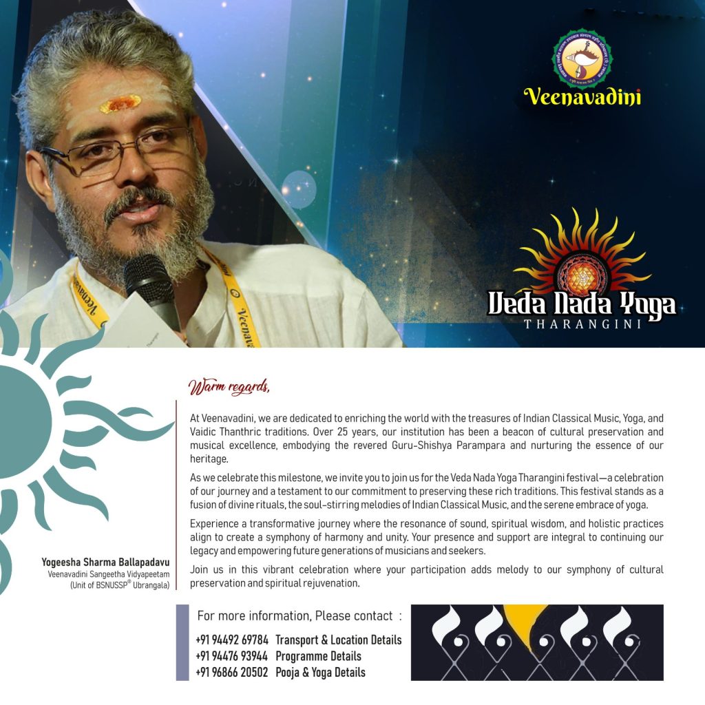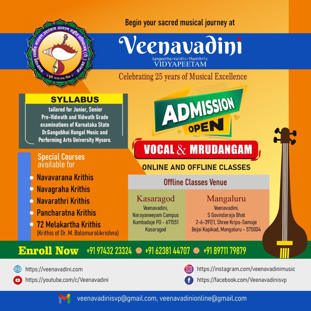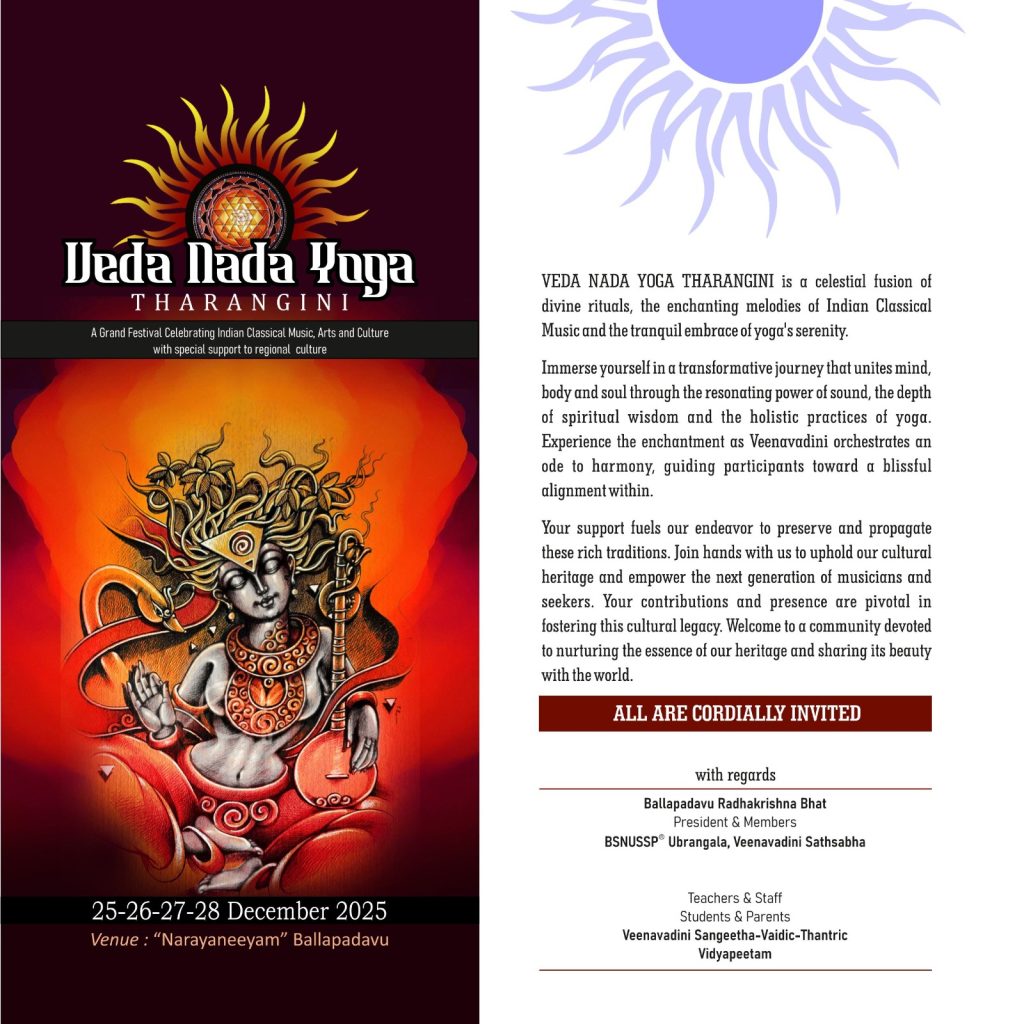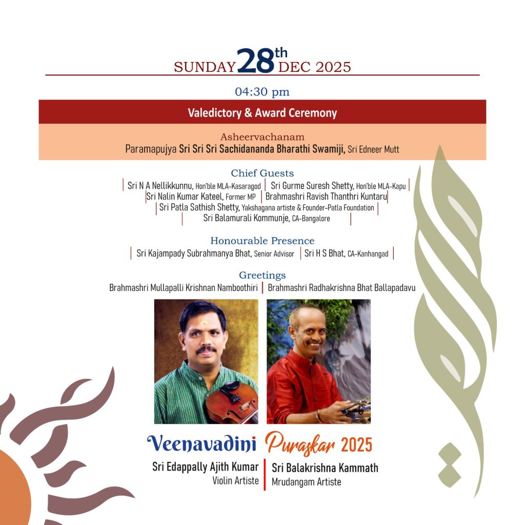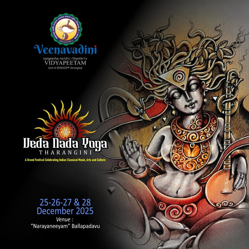 ಕಾಸರಗೋಡು : ಕಾಸರಗೋಡಿನ ಬದಿಯಡ್ಕ ಬಳಿಯ ವೀಣಾವಾದಿನಿ ಸಂಗೀತ ಹಾಗೂ ವೈದಿಕ – ತಾಂತ್ರಿಕ ವಿದ್ಯಾಪೀಠದ ವಾರ್ಷಿಕೋತ್ಸವ ‘ವೇದ ನಾದ ಯೋಗ ತರಂಗಿಣಿ’ ಸಾಂಸ್ಕೃತಿಕ ವೈಭವವು ದಿನಾಂಕ 25ರಿಂದ 28 ಡಿಸೆಂಬರ್ 2025ರವರೆಗೆ ವೈದಿಕ, ತಾಂತ್ರಿಕ, ಯೋಗ, ಸಂಗೀತ, ನೃತ್ಯ ಮುಂತಾದ ವೈವಿಧ್ಯಮಯ ಸಾಂಸ್ಕೃತಿಕ ಕಾರ್ಯಕ್ರಮಗಳೊಂದಿಗೆ ಬಳ್ಳಪದವು ನಾರಾಯಣೀಯಂ ಆವರಣದಲ್ಲಿ ನಡೆಯಲಿದೆ.