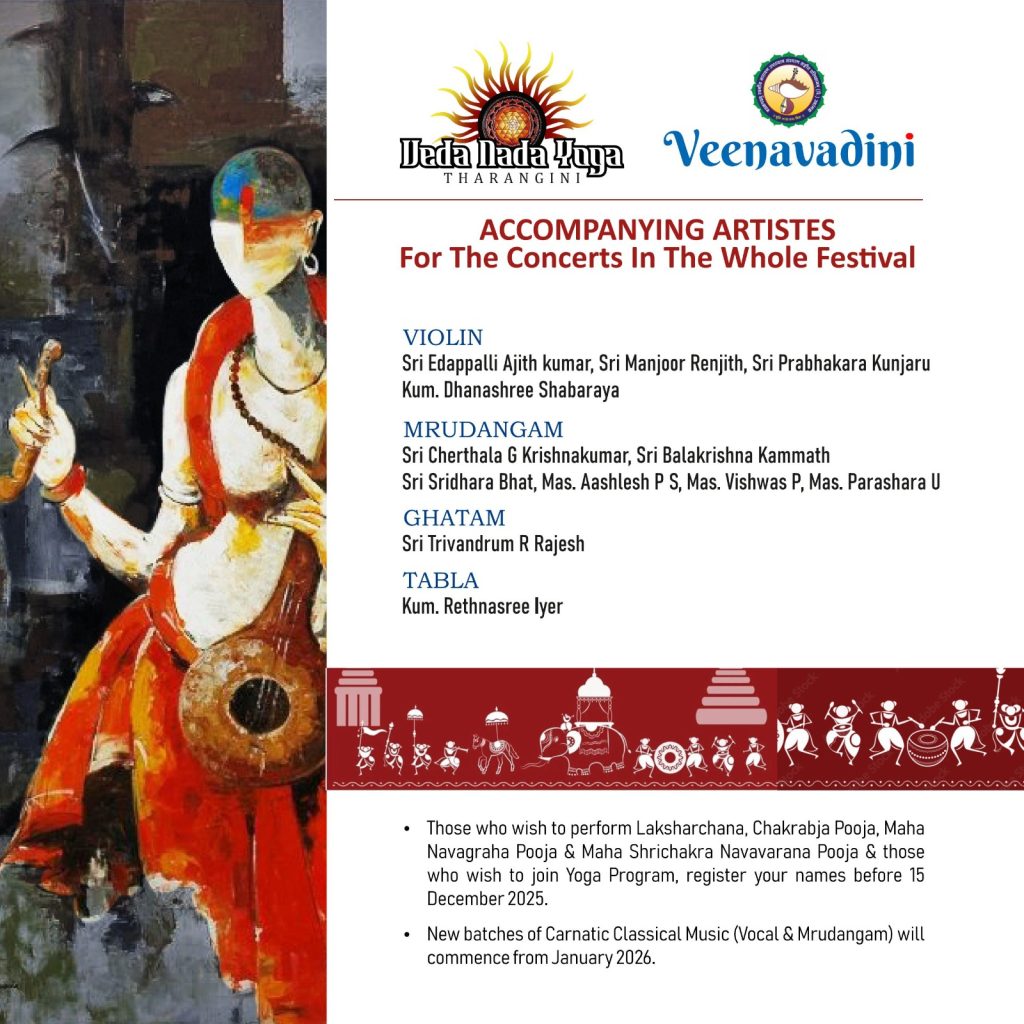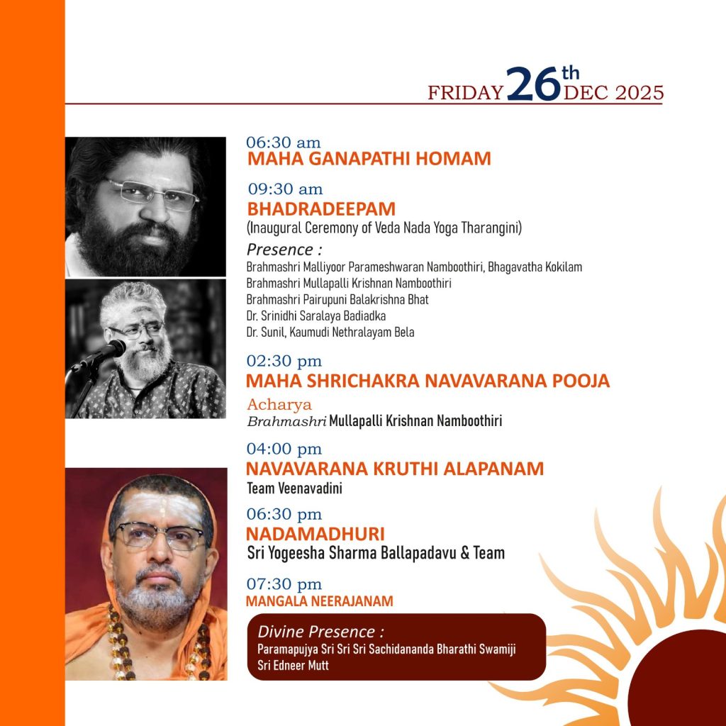 ದಿನಾಂಕ 26 ಡಿಸೆಂಬರ್ 2025ರಂದು ಬೆಳಗ್ಗೆ ಗಂಟೆ 9-30ಕ್ಕೆ ಎಡನೀರು ಮಠಾಧೀಶರಾದ ಶ್ರೀ ಸಚ್ಚಿದಾನಂದ ಭಾರತೀ ಸ್ವಾಮೀಜಿ ಇವರ ಉಪಸ್ಥಿತಿಯಲ್ಲಿ ಉದ್ಘಾಟನಾ ಕಾರ್ಯಕ್ರಮ ಜರಗಲಿದೆ. ಬಳಿಕ ವಿವಿಧ ವಾದ್ಯವಾದನಗಳ ಸಾಂಗತ್ಯದಲ್ಲಿ, ‘ಸಮನ್ವಯ’ ಎಂಬ ವಿಶೇಷ ಕಾರ್ಯಕ್ರಮ ಜರಗಲಿದ್ದು, ಮಹಾಶ್ರೀಚಕ್ರ ನವಾವರಣ ಪೂಜೆ, ತತ್ಸಂಬಂ ನವಾವರಣ ಕೃತಿಗಳ ಆಲಾಪನೆ, ವಿದ್ವಾನ್ ಯೋಗೀಶ ಶರ್ಮಾ ಬಳ್ಳಪದವು ಇವರಿಂದ ‘ನಾದಮಾಧುರಿ’ ಎಂಬ ಸಂಗೀತಸೇವೆ ಏರ್ಪಡಲಿದೆ. ಇದಕ್ಕೂ ಎಡನೀರು ಮಠಾಧೀಶರು ಹಾಗೂ ಕೊಂಡೆವೂರು ಶ್ರೀ ಯೋಗಾನಂದ ಸರಸ್ವತಿ ಸ್ವಾಮೀಜಿಯವರ ಉಪಸ್ಥಿತಿ ಇರಲಿದೆ.