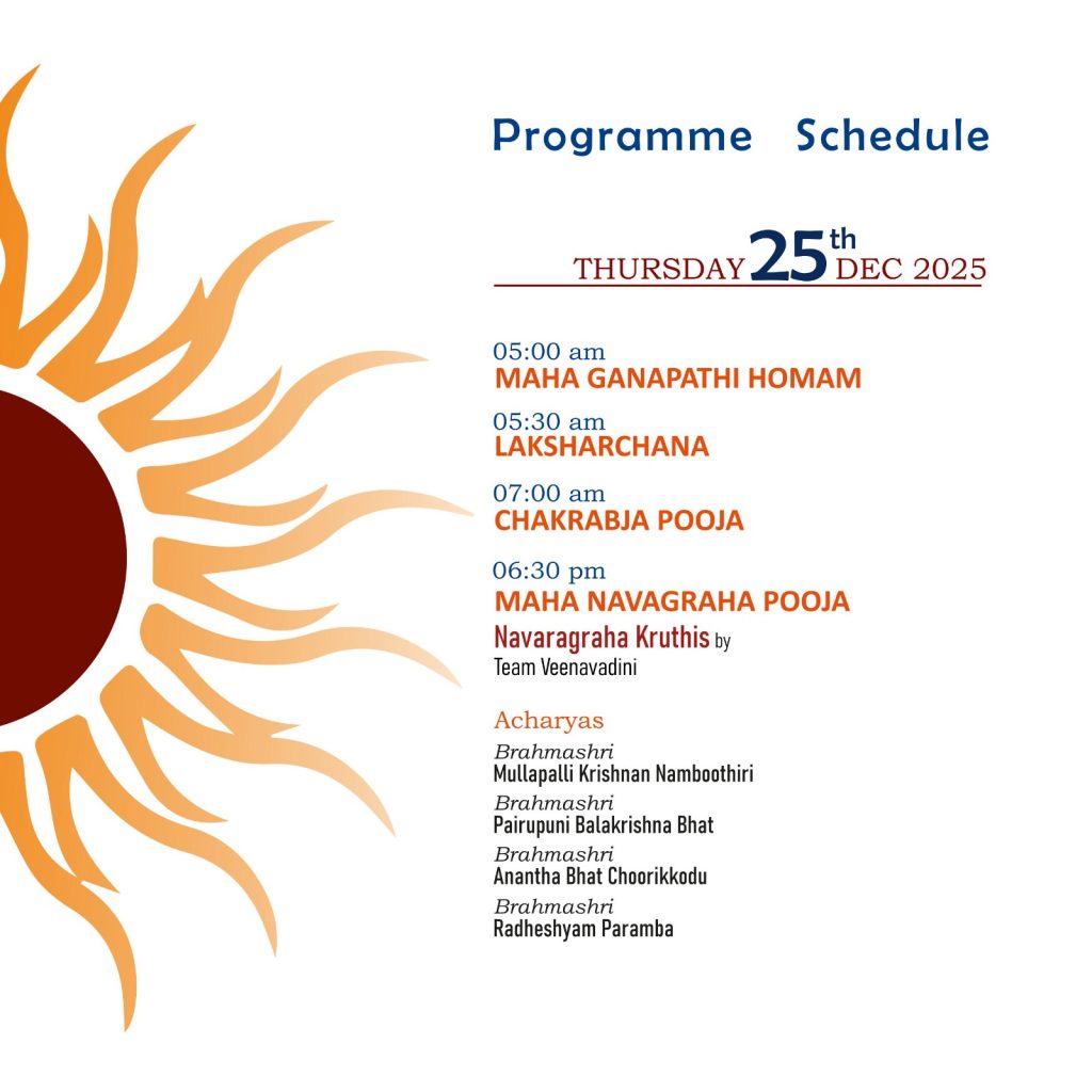 ದಿನಾಂಕ 25 ಡಿಸೆಂಬರ್ 2025ರಂದು ಬೆಳಗ್ಗೆ 5-00 ಗಂಟೆಗೆ ಮಹಾಗಣಪತಿ ಹೋಮ, ಲಕ್ಷಾರ್ಚನೆ, ಚಕ್ರಾಬ್ಬಪೂಜೆ ಮತ್ತು ಸಂಜೆ 6-30ಕ್ಕೆ ನವಗ್ರಹಪೂಜೆ ಹಾಗೂ ಪೂಜೆಯ ಜೊತೆ ವೀಣಾವಾದಿನಿಯ ವಿದ್ಯಾರ್ಥಿ ಕಲಾವಿದರಿಂದ ನವಗ್ರಹ ಕೃತಿಗಳ ಹಾಡುಗಾರಿಕೆ ಇರುತ್ತದೆ.