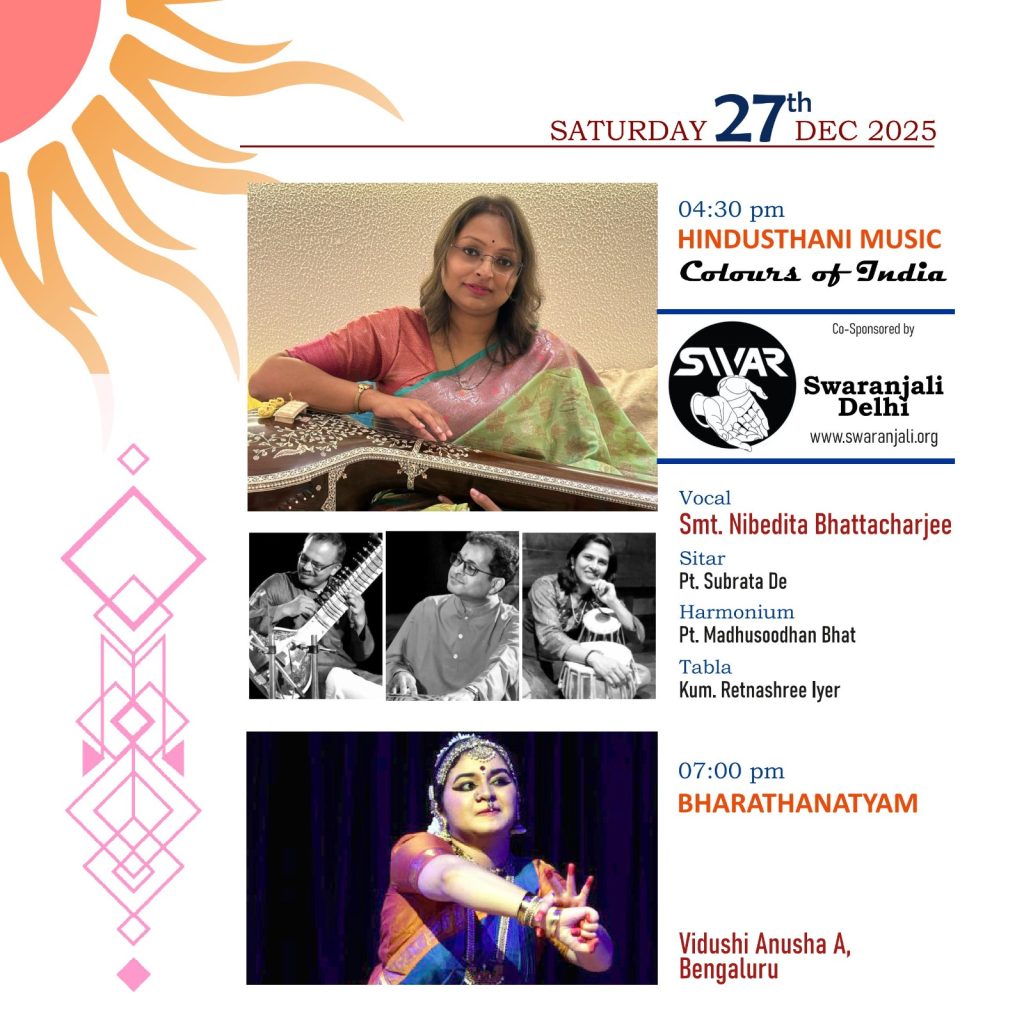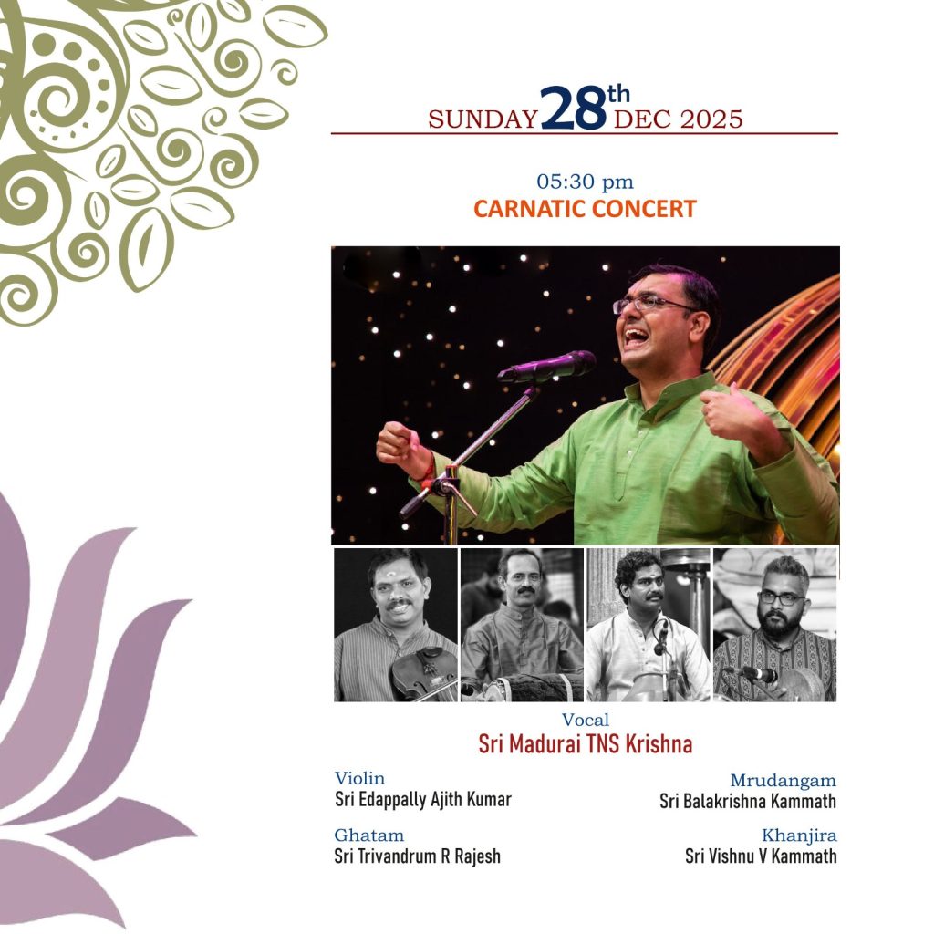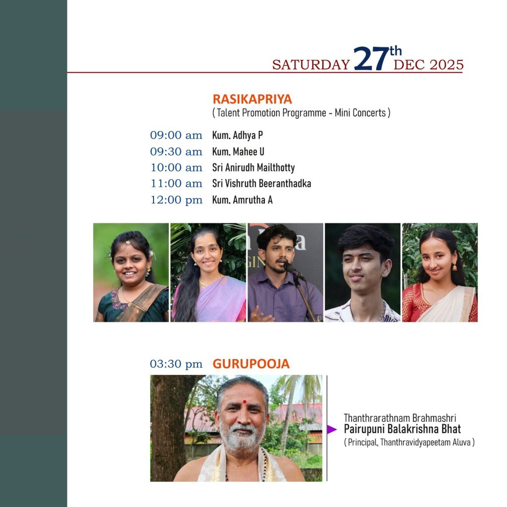 ದಿನಾಂಕ 27 ಡಿಸೆಂಬರ್ 2025ರಂದು ಸಂಸ್ಥೆಯ ವಿದ್ಯಾರ್ಥಿ ಕಲಾವಿದರಿಂದ ‘ರಸಿಕಪ್ರಿಯ’ ಎಂಬ ಹೆಸರಿನಲ್ಲಿ ಹಾಡುಗಾರಿಕೆಯ ಕಛೇರಿಗಳು, ತಂತ್ರಿವರ್ಯರಾದ ಬ್ರಹ್ಮಶ್ರೀ ಬಾಲಕೃಷ್ಣ ಭಟ್ ಪೈರುವುಣಿ ಇವರಿಗೆ ಗುರುಪೂಜೆ, ದೆಹಲಿಯ ಸ್ವರಾಂಜಲಿ ಸಂಸ್ಥೆಯ ನಿವೇದಿತಾ ಭಟ್ಟಾಚಾರ್ಜಿ ಹಾಗೂ ತಂಡದಿಂದ ಹಿಂದೂಸ್ವಾನೀ ಸಂಗೀತ ಕಛೇರಿ ಹಾಗೂ ಬೆಂಗಳೂರಿನ ವಿದುಷಿ ಅನುಷಾ ಇವರಿಂದ ಭರತನಾಟ್ಯ ಕಾರ್ಯಕ್ರಮ ಜರಗಲಿದೆ.