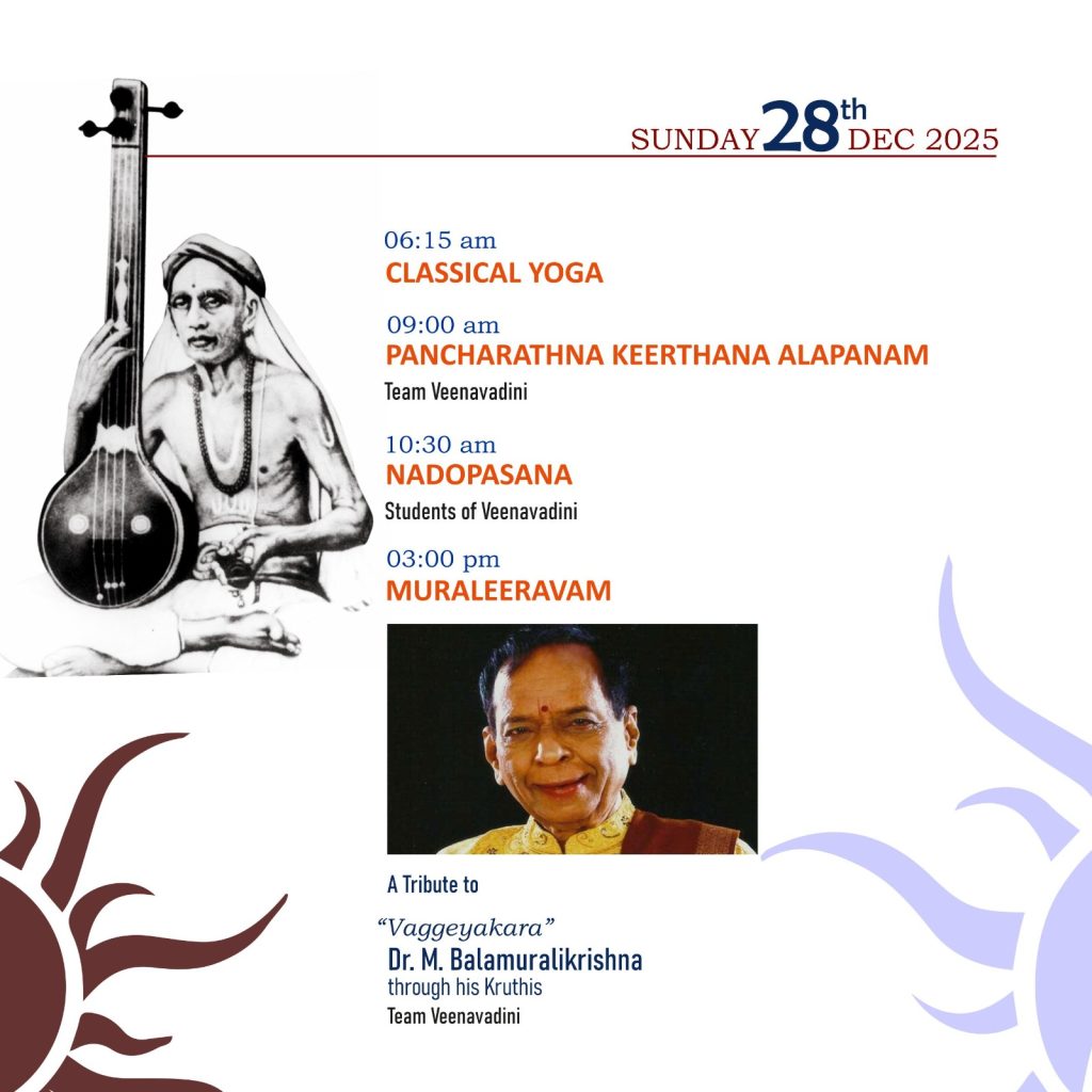 ದಿನಾಂಕ 28 ಡಿಸೆಂಬರ್ 2025ರಂದು ಮುಂಜಾನೆ ಯೋಗ ಕಾರ್ಯಕ್ರಮ, ತ್ಯಾಗರಾಜರ ಪಂಚರತ್ನ ಕೃತಿಗಳ ಹಾಡುಗಾರಿಕೆ, ವಿದ್ಯಾರ್ಥಿಗಳಿಂದ ನಾದೋಪಾಸನಾ ಸಂಗೀತಾರ್ಚನೆ ಮತ್ತು ವಾಗ್ಗೇಯಕಾರ ಡಾ. ಎಂ. ಬಾಲಮುರಳಿಕೃಷ್ಣ ಇವರಿಗೆ ಗೌರವಪೂರ್ವಕವಾಗಿ ‘ಮುರಳೀರವಂ’ ಎಂಬ ಸಂಗೀತ ಕಾರ್ಯಕ್ರಮ ನಡೆಯಲಿವೆ. ಸಂಜೆ 4-30ಕ್ಕೆ ಸಮಾರೋಪ ಹಾಗೂ ಪ್ರಶಸ್ತಿ ಪ್ರದಾನ ಸಮಾರಂಭದಲ್ಲಿ ಈ ವರ್ಷದ ‘ವೀಣಾವಾದಿನಿ ಪುರಸ್ಕಾರ’ವನ್ನು ವಯಲಿನ್ ಕಲಾವಿದ ಎಡಪಳ್ಳಿ ಅಜಿತ್ ಕುಮಾರ್ ಮತ್ತು ಹಿರಿಯ ಮೃದಂಗ ಕಲಾವಿದ ಬಾಲಕೃಷ್ಣ ಕಾಮತ್ ಇವರಿಗೆ ನೀಡಲಾಗುತ್ತಿದೆ. ಬಳಿಕ ಮಧುರೈ ಟಿ.ಎನ್.ಎಸ್. ಕೃಷ್ಣ ಇವರಿಂದ ಸಂಗೀತ ಕಛೇರಿಯೊಂದಿಗೆ ಉತ್ಸವಕ್ಕೆ ತೆರೆ ಬೀಳಲಿದೆ.
