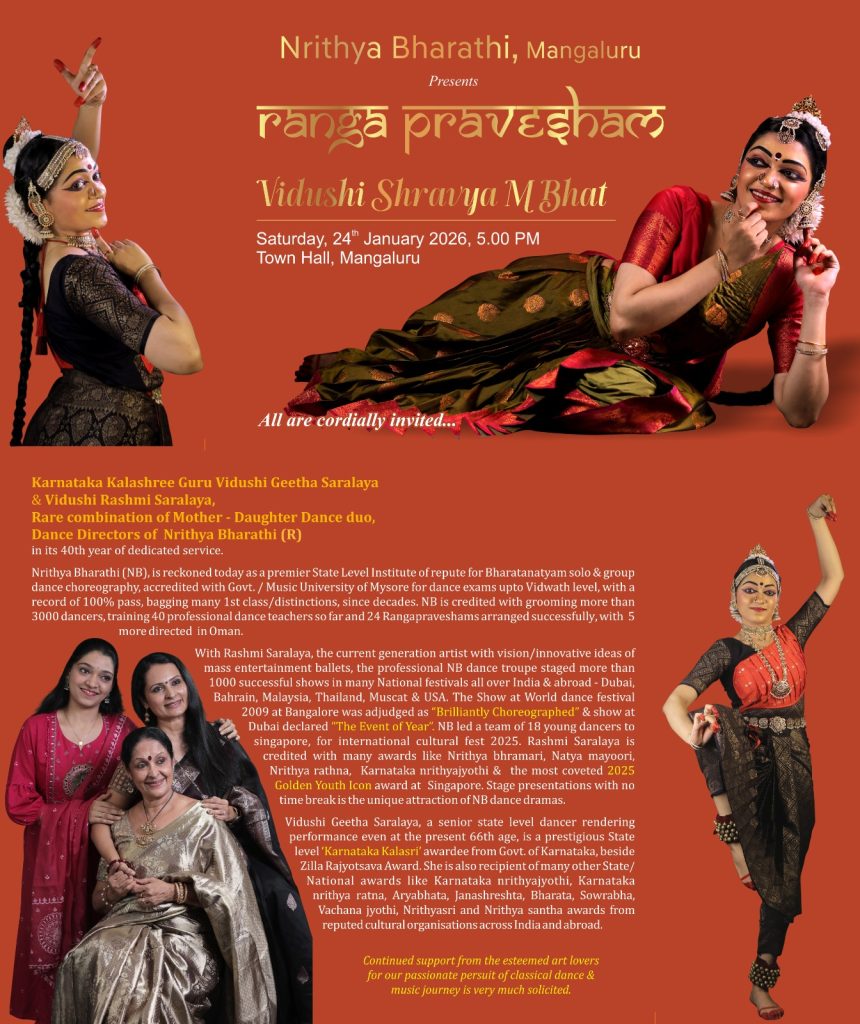 ಮಂಗಳೂರು : ನೃತ್ಯ ಭಾರತಿ (ರಿ.) ಕದ್ರಿ ಮಂಗಳೂರು ಮತ್ತು ಶ್ರೀಮತಿ ರಾಧಾ ಕೆ. ಹಾಗೂ ಶಿವಪ್ರಸಾದ್ ಎಂ. ಭಟ್ ಇವರ ವತಿಯಿಂದ ವಿದುಷಿ ಶ್ರಾವ್ಯ ಎಂ. ಭಟ್ ಇವರ ಭರತನಾಟ್ಯ ರಂಗಪ್ರವೇಶಂ ಕಾರ್ಯಕ್ರಮವನ್ನು ದಿನಾಂಕ 24 ಜನವರಿ 2026ರಂದು ಸಂಜೆ 5-00 ಗಂಟೆಗೆ ಮಂಗಳೂರಿನ ಪುರಭವನದಲ್ಲಿ ಹಮ್ಮಿಕೊಳ್ಳಲಾಗಿದೆ.