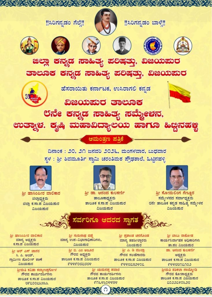 ವಿಜಯಪುರ : ಜಿಲ್ಲಾ ಕನ್ನಡ ಸಾಹಿತ್ಯ ಪರಿಷತ್ತು ವಿಜಯಪುರ, ತಾಲೂಕು ಕನ್ನಡ ಸಾಹಿತ್ಯ ಪರಿಷತ್ತು ವಿಜಯಪುರ ಇವರ ಸಹಯೋಗದಲ್ಲಿ ವಿಜಯಪುರ ತಾಲೂಕು 8ನೇ ಕನ್ನಡ ಸಾಹಿತ್ಯ ಸಮ್ಮೇಳನವನ್ನು ದಿನಾಂಕ 20 ಮತ್ತು 21 ಜನವರಿ 2026ರಂದು ಹಿಟ್ಟಿನಹಳ್ಳಿ ಶ್ರೀ ಶಿವಮೂರ್ತಿ ಸ್ವಾಮಿ ಚರಂತಿಮಠ ಪ್ರೌಢ ಶಾಲೆಯಲ್ಲಿ ಹಮ್ಮಿಕೊಳ್ಳಲಾಗಿದೆ. ಸಮ್ಮೇಳನದ ಸರ್ವಾಧ್ಯಕ್ಷರಾಗಿ ಸಾಹಿತಿ ಸೋಮಲಿಂಗ ಗೆಣ್ಣೂರ ಸರ್ವಾನುಮತದಿಂದ ಆಯ್ಕೆಯಾಗಿದ್ದಾರೆ.