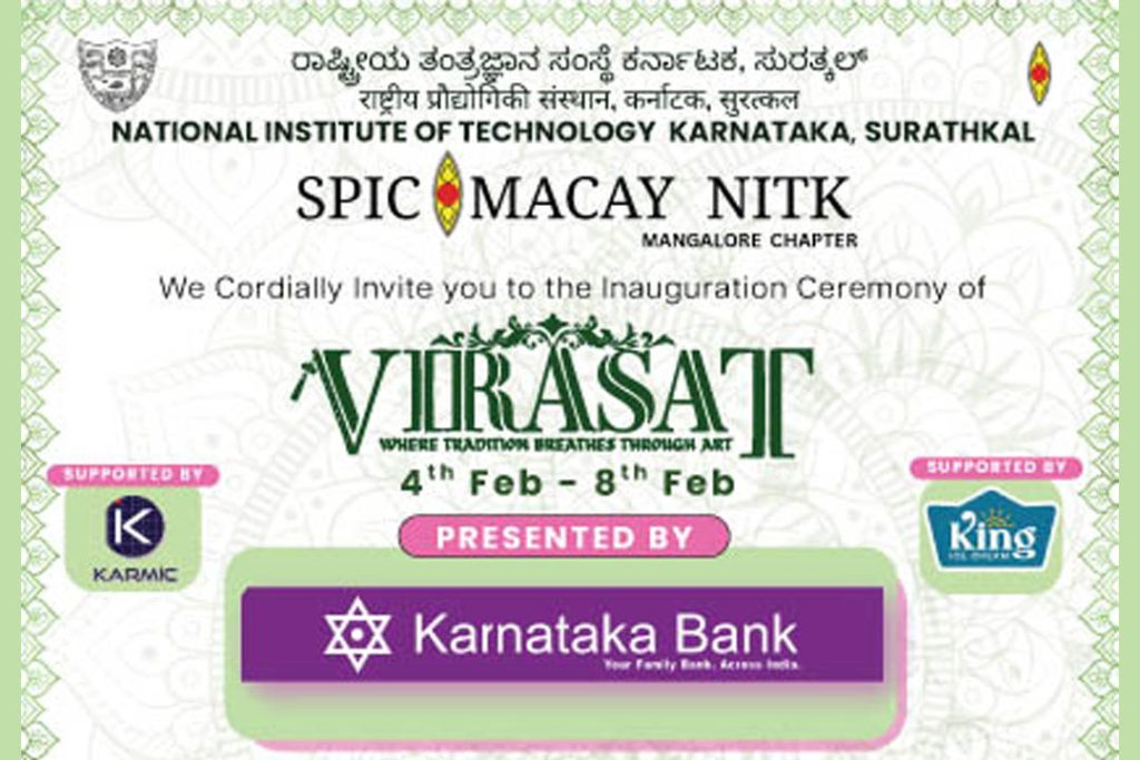 ಮಂಗಳೂರು : ಸ್ಪೀಕ್ ಮಕೇ ಎನ್.ಐ.ಟಿ.ಕೆ. ಇವರು ಪ್ರಸ್ತುತ ಪಡಿಸುವ ‘ವಿರಾಸತ್’ ಸಂಗೀತ, ನೃತ್ಯ ಪ್ರದರ್ಶನ ಮತ್ತು ಕಾರ್ಯಾಗಾರವನ್ನು ದಿನಾಂಕ 4ರಿಂದ 8 ಫೆಬ್ರುವರಿ 2026ರಂದು ಸುರತ್ಕಲ್ಲಿನ ಎನ್.ಐ.ಟಿ.ಕೆ.ಯ ಸಿಲ್ವರ್ ಜುಬಿಲಿ ಸಭಾಂಗಣದಲ್ಲಿ ಆಯೋಜಿಸಲಾಗಿದೆ.