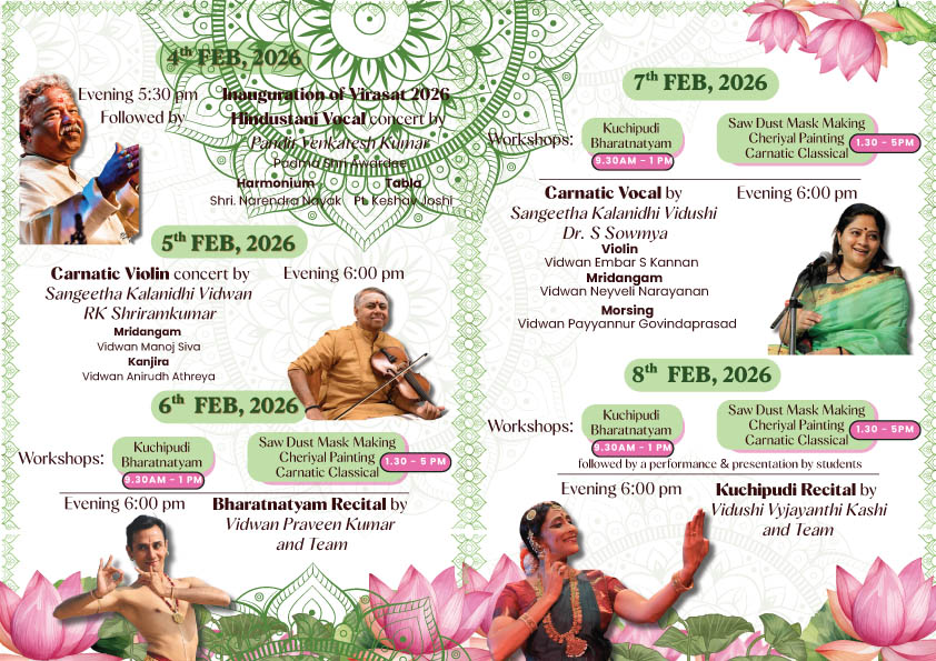 ದಿನಾಂಕ 7 ಫೆಬ್ರುವರಿ 2026ರಂದು ಬೆಳಗ್ಗೆ 9-30 ಗಂಟೆಗೆ ವಿದುಷಿ ವೈಜಯಂತಿ ಕಾಶಿ ಇವರಿಂದ ಕೂಚಿಪುರಿ ಮತ್ತು ವಿದ್ವಾನ್ ಪ್ರವೀಣ್ ಕುಮಾರ್ ಇವರಿಂದ ಭರತನಾಟ್ಯ ಹಾಗೂ 1-30 ಗಂಟೆಗೆ ಶ್ರೀಮತಿ ಡಿ. ಪದ್ಮ ಇವರಿಂದ ‘ಸ್ವಡಸ್ಟ್ ಮಾಸ್ಕ್ ಮೇಕಿಂಗ್’, ಶ್ರೀ ಡಿ. ನಾಗೇಶ್ವರ್ ರಾವ್ ಇವರಿಂದ ‘ಚೆರಿಯಾಲ್ ಪೆಯಿಂಟಿಂಗ್’ ಮತ್ತು ವಿದುಷಿ ಮಾನಸಿ ಪ್ರಸಾದ್ ಇವರಿಂದ ಕರ್ನಾಟಿಕ್ ಶಾಸ್ತ್ರೀಯ ಸಂಗೀತದ ಕಾರ್ಯಾಗಾರ ನಡೆಯಲಿದೆ. ಸಂಜೆ 6-00 ಗಂಟೆಗೆ ವಿದುಷಿ ಎಸ್. ಸೌಮ್ಯ ಇವರ ಹಾಡುಗಾರಿಕೆ ನಡೆಯಲಿದೆ.
