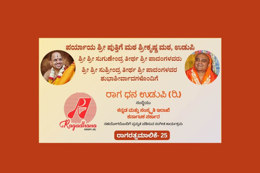 ಉಡುಪಿ : ರಾಗ ಧನ ಉಡುಪಿ ಸಂಸ್ಥೆ ಮತ್ತು ಕನ್ನಡ ಮತ್ತು ಸಂಸ್ಕೃತಿ ಇಲಾಖೆಯ ಸಹಯೋಗದೊಂದಿಗೆ ಪ್ರಸ್ತುತ ಪಡಿಸುವ ‘ರಾಗರತ್ನ ಮಾಲಿಕೆ’ -25 ಸಂಗೀತ ಕಾರ್ಯಕ್ರಮವು ದಿನಾಂಕ 02-06-2024ರಂದು ಸಂಜೆ 7-00 ಗಂಟೆಗೆ ಉಡುಪಿ ಶ್ರೀಕೃಷ್ಣ ಮಠದ ರಾಜಾಂಗಣದಲ್ಲಿ ನಡೆಯಲಿದೆ.