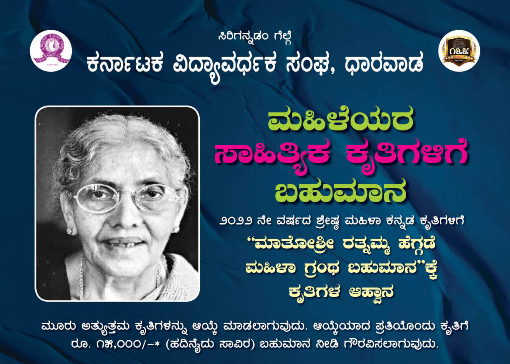 ಧಾರವಾಡ: ಕರ್ನಾಟಕ ವಿದ್ಯಾವರ್ಧಕ ಸಂಘ, ಧಾರವಾಡ ಮಹಿಳೆಯರ ಕನ್ನಡದ ಶ್ರೇಷ್ಠ ಕೃತಿಗಳಿಗೆ 2022 ನೇ ಸಾಲಿನ “ಮಾತೋಶ್ರೀ ರತ್ನಮ್ಮ ಹೆಗ್ಗಡೆ ಮಹಿಳಾ ಗ್ರಂಥ ಬಹುಮಾನ”ಕ್ಕೆ ಕೃತಿಗಳನ್ನು ಆಹ್ವಾನಿಸಲಾಗಿದೆ.