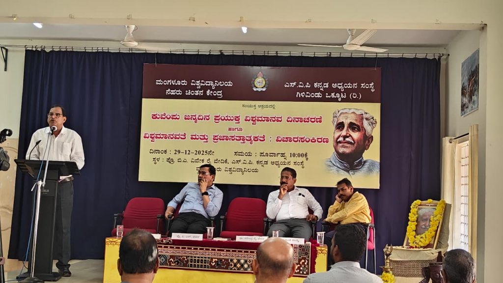 ಕೋಣಾಜೆ : ಮಂಗಳೂರು ವಿಶ್ವವಿದ್ಯಾನಿಲಯ, ನೆಹರೂ ಚಿಂತನ ಕೇಂದ್ರ, ಎಸ್.ವಿ.ಪಿ. ಕನ್ನಡ ಅಧ್ಯಯನ ಸಂಸ್ಥೆ ಹಾಗೂ ಗಿಳಿವಿಂಡು ಒಕ್ಕೂಟ ಇದರ ವತಿಯಿಂದ ಕುವೆಂಪು ಜನ್ಮದಿನ ಪ್ರಯುಕ್ತ ವಿಶ್ವಮಾನವ ದಿನಾಚರಣೆ ಹಾಗೂ ವಿಶ್ವಮಾನವತೆ ಮತ್ತು ಪ್ರಜಾಸತ್ತಾತ್ಮಕತೆ ಎಂಬ ವಿಷಯದಲ್ಲಿ ವಿಚಾರಸಂಕಿರಣವು ದಿನಾಂಕ 29 ಡಿಸೆಂಬರ್ 2025ರಂದು ಮಂಗಳೂರು ವಿಶ್ವವಿದ್ಯಾನಿಲಯದ ಪ್ರೊ. ವಿವೇಕ್ ರೈ ವಿಚಾರ ವೇದಿಕೆಯಲ್ಲಿ ನಡೆಯಿತು.