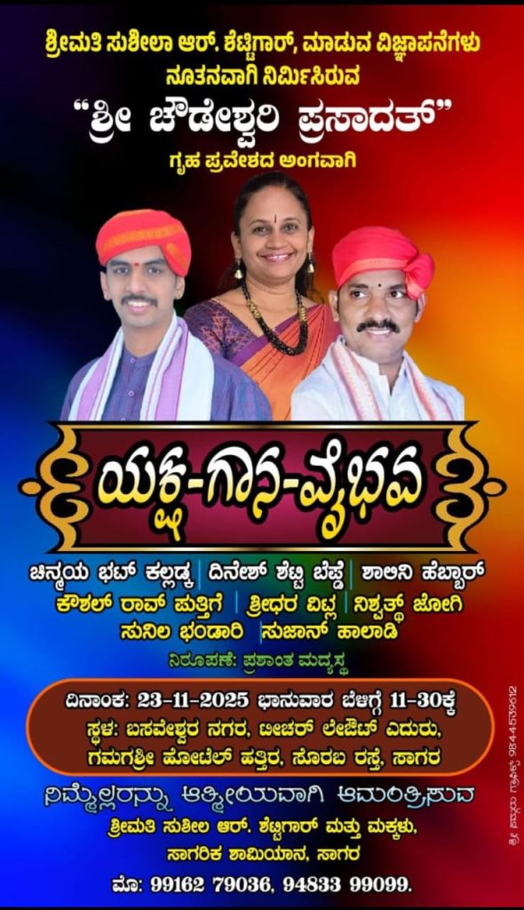 ಸಾಗರ : ಶ್ರೀಮತಿ ಸುಶೀಲಾ ಆರ್. ಶೆಟ್ಟಿಗಾರ್ ಇವರು ನೂತನವಾಗಿ ನಿರ್ಮಿಸಿರುವ ‘ಶ್ರೀ ಚೌಡೇಶ್ವರಿ ಪ್ರಸಾದತ್’ ಗೃಹಪ್ರವೇಶದ ಅಂಗವಾಗಿ ‘ಯಕ್ಷ-ಗಾನ-ವೈಭವ’ ಕಾರ್ಯಕ್ರಮವನ್ನು ದಿನಾಂಕ 23 ನವೆಂಬರ್ 2025ರಂದು ಬೆಳಗ್ಗೆ 11-30 ಗಂಟೆಗೆ ಸಾಗರ ಸೊರಬ ರಸ್ತೆ ಗಮಗಶ್ರೀ ಹೊಟೇಲ್ ಹತ್ತಿರ, ಟೀಚರ್ ಲೇಔಟ್ ಎದುರು ಬಸವೇಶ್ವರ ನಗರದಲ್ಲಿ ಆಯೋಜಿಸಲಾಗಿದೆ.