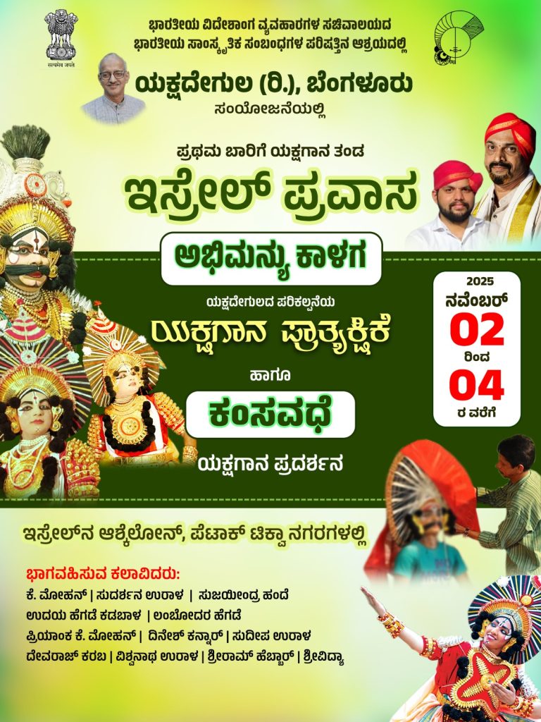 ಇಸ್ರೇಲ್‌ನಲ್ಲಿ ಪ್ರಥಮ ಬಾರಿಗೆ ಯಕ್ಷಗಾನ ಪ್ರಾತ್ಯಕ್ಷಿಕೆ ಮತ್ತು ಪ್ರದರ್ಶನ | ನವೆಂಬರ್ 02ರಿಂದ 04