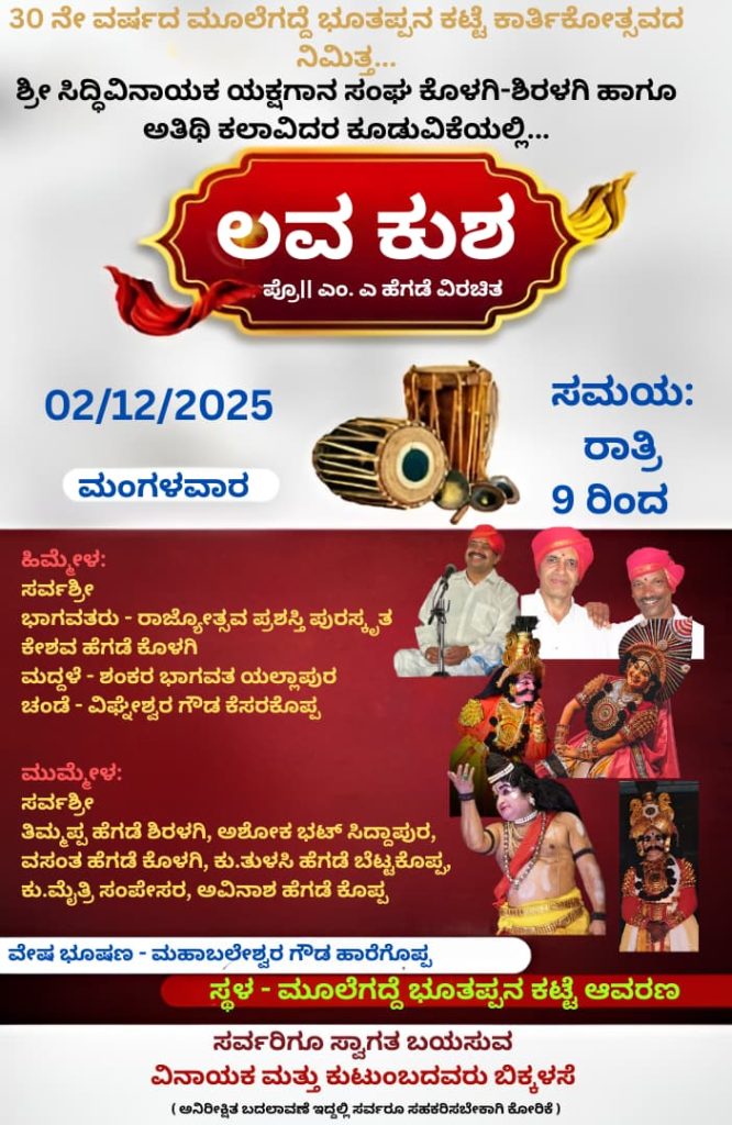 ಸಿದ್ಧಾಪುರ : ಶ್ರೀ ಸಿದ್ಧಿವಿನಾಯಕ ಯಕ್ಷಗಾನ ಸಂಘ ಕೊಳಗಿ-ಶಿರಳಗಿ ಹಾಗೂ ಅತಿಥಿ ಕಲಾವಿದರ ಕೂಡುವಿಕೆಯಲ್ಲಿ ಎಂ.ಎಂ. ಹೆಗಡೆ ವಿರಚಿತ ‘ಲವ ಕುಶ’ ಯಕ್ಷಗಾನ ಪ್ರದರ್ಶನವನ್ನು 30ನೇ ವರ್ಷದ ಮೂಲೆಗದ್ದೆ ಭೂತಪ್ಪನ ಕಟ್ಟೆ ಕಾರ್ತಿಕೋತ್ಸವದ ನಿಮಿತ್ತ ದಿನಾಂಕ 02 ಡಿಸೆಂಬರ್ 2025ರಂದು ರಾತ್ರಿ 9-00 ಗಂಟೆಗೆ ಮೂಲೆಗದ್ದೆ ಭೂತಪ್ಪನ ಕಟ್ಟೆ ಆವರಣದಲ್ಲಿ ಹಮ್ಮಿಕೊಳ್ಳಲಾಗಿದೆ.