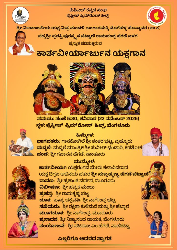 ಬೆಂಗಳೂರು : ಪಿ.ಪಿ.ಎಚ್. ಕನ್ನಡ ಸಂಘ ಪ್ರೆಸ್ಟೀಜ್ ಪ್ರಿಮ್ ರೋಸ್ ಹಿಲ್ಸ್ ಇವರ ವತಿಯಿಂದ ಶ್ರೀ ವೀರಾಂಜನೇಯ ಯಕ್ಷ ಮಿತ್ರ ಮಂಡಳಿ, ಬಂಗಾರಮಕ್ಕಿ ಮೊಗೆಹಳ್ಳ ಹೊನ್ನಾವರ (ಉ.ಕ.) ಪದ್ಮ ಶ್ರೀ ಪ್ರಶಸ್ತಿ ಪುರಸ್ಕೃತ ಚಿಟ್ಟಾಣಿ ರಾಮಚಂದ್ರ ಹೆಗಡೆ ಬಳಗ ಪ್ರಸ್ತುತ ಪಡಿಸುತ್ತಿರುವ ‘ಕಾರ್ತವೀರ್ಯಾರ್ಜುನ’ ಯಕ್ಷಗಾನ ಪ್ರದರ್ಶನವನ್ನು ದಿನಾಂಕ 22 ನವೆಂಬರ್ 2025ರಂದು ಸಂಜೆ 5-30 ಗಂಟೆಗೆ ಬೆಂಗಳೂರಿನ ಪ್ರೆಸ್ಟೀಜ್ ಪ್ರಿಮ್ ರೋಸ್ ಹಿಲ್ಸ್ ನಲ್ಲಿ ಹಮ್ಮಿಕೊಳ್ಳಲಾಗಿದೆ.
