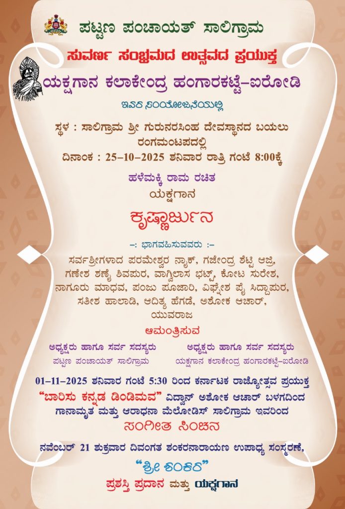 ಸಾಲಿಗ್ರಾಮ : ಪಟ್ಟಣ ಪಂಚಾಯತ್ ಸಾಲಿಗ್ರಾಮ ಇದರ ಸುವರ್ಣ ಸಂಭ್ರಮದ ಉತ್ಸವದ ಪ್ರಯುಕ್ತ ಯಕ್ಷಗಾನ ಕಲಾ ಕೇಂದ್ರ ಹಂಗಾರಕಟ್ಟೆ ಐರೋಡಿ ಇವರ ಸಂಯೋಜನೆಯಲ್ಲಿ ಯಕ್ಷಗಾನ ಪ್ರದರ್ಶನವನ್ನು ದಿನಾಂಕ 25 ಅಕ್ಟೋಬರ್ 2025ರಂದು ರಾತ್ರಿ ಗಂಟೆ 8-00ಕ್ಕೆ ಸಾಲಿಗ್ರಾಮ ಶ್ರೀ ಗುರುನರಸಿಂಹ ದೇವಸ್ಥಾನದ ಬಯಲು ರಂಗಮಂಟಪದಲ್ಲಿ ಹಮ್ಮಿಕೊಳ್ಳಲಾಗಿದೆ.